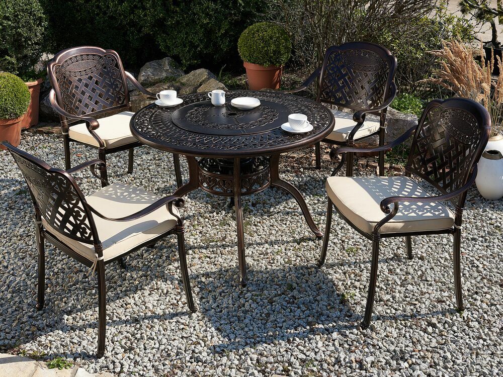 Využite teplé letné dni naplno a užite si dokonalé pohodlie vďaka tomuto záhradnému stolu s grilom. Stôl je vyrobený z pevného hliníka a vďaka svojmu elegantnému vintage dizajnu skrášli každú terasu či balkón. Súčasťou stola je aj vstavaný gril, ktorý možno zakryť odnímateľnou vrchnou stolovou doskou. Doplňte ho stoličkami v rovnakom štýle a vytvorte si dokonalý vonkajší jedálenský kút.