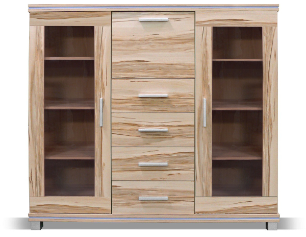 Praktická trojdielna vitrína s rôznymi možnosťami uloženia Vašich vecí. Po stranách su presklené časti s poličkami pre umiestnenie predmetov, ktoré chcete aby boli viditeľné. V strede sa nachádzajú štyri zásuvky a v hornej časti barová skrinka s výklopnými dvierkami.