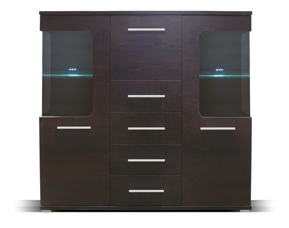 Trojdielna vitrína s množstvom úložného priestoru. V častiach, ktoré sú uzavreté plnými dvierkami sú drevené poličky a v presklených častiach poličky sklenené. Tie sú podsvietené efektným LED osvetlením, ktoré nielen zvýrazní predmety umiestnené na nich, ale aj navodí príjemnú atmosféru celéhu priestoru. V strednej časti sú umiestnené štyri zásuvky a jedny výklopné dvierka s priestorom určeným na bar.