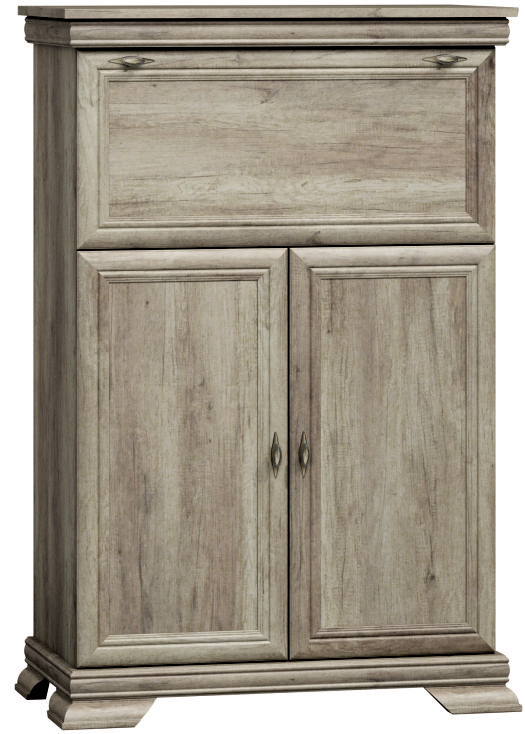 Barová skrinka s výklopnými dvierkami, pod ktorými je skrinka s dvomi dvierkami a poličkou.