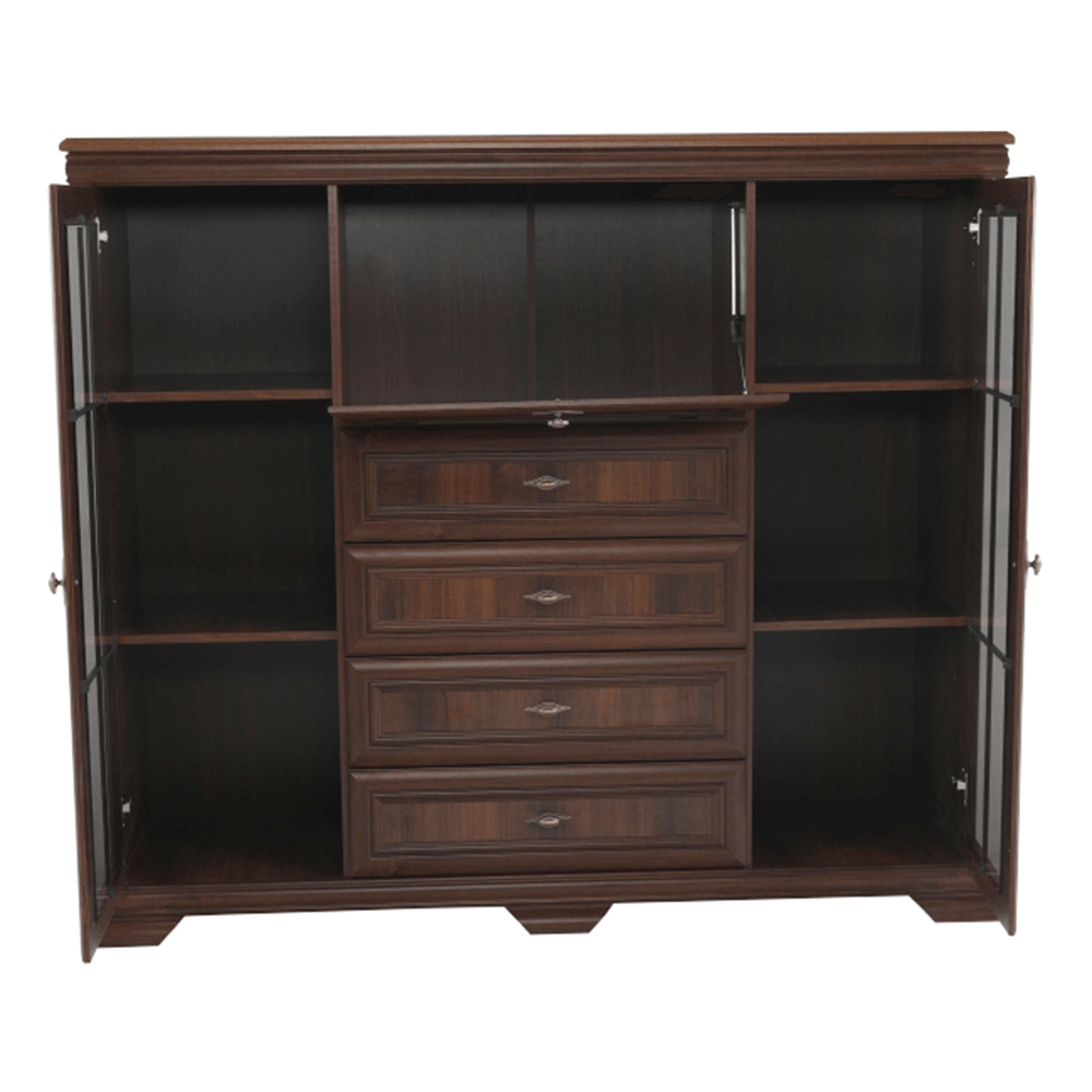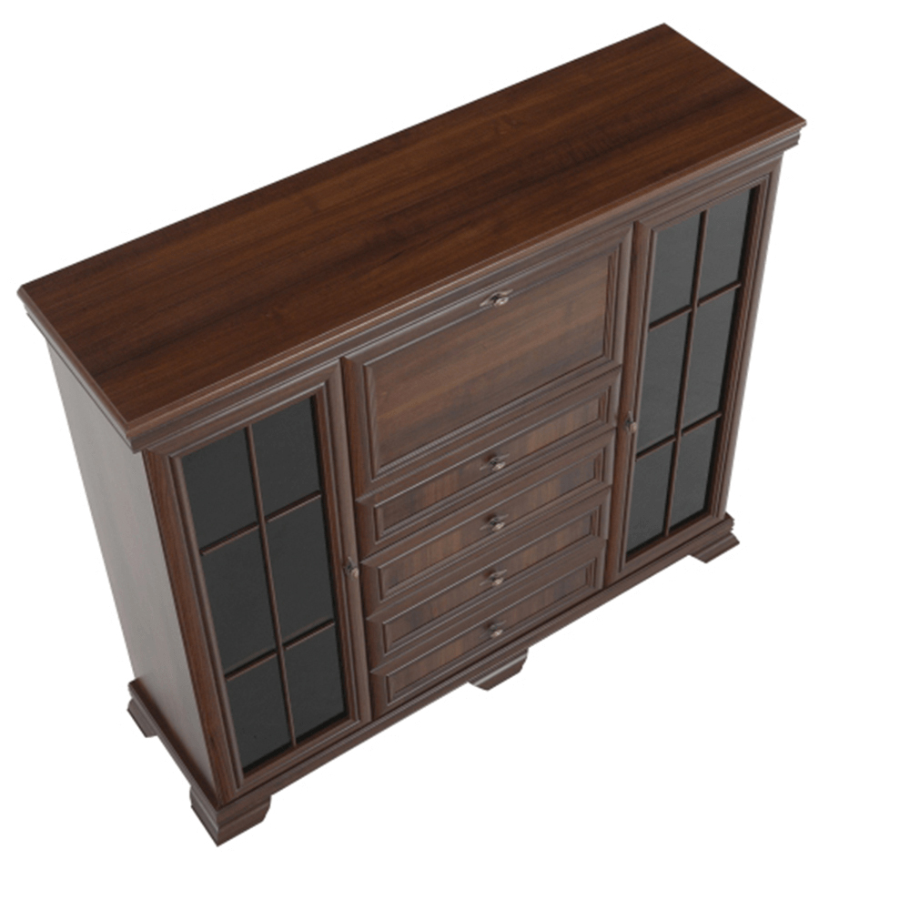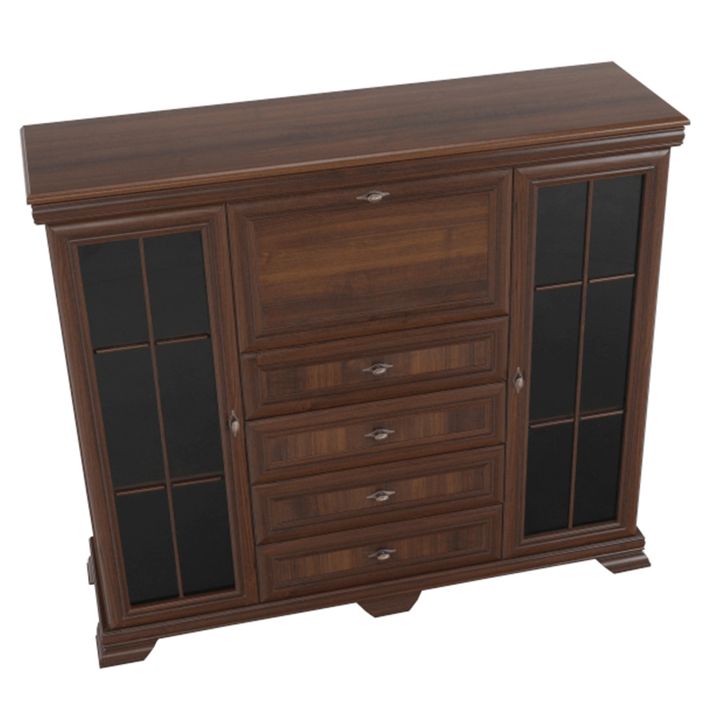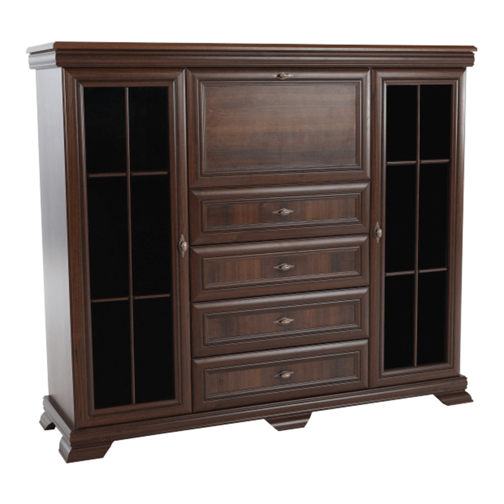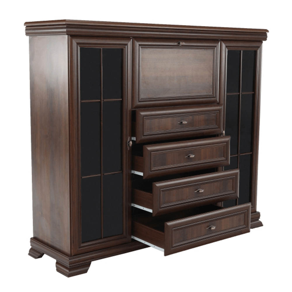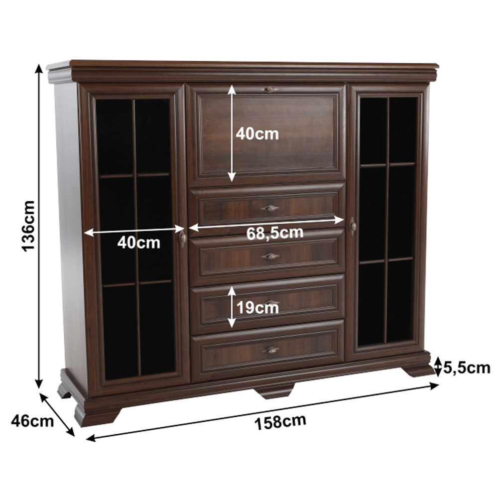 Barová skrinka Kraz KK7 má výšku 136 cm, šírku 158 cm a hĺbku 46 cm. Je to dvojdverová komoda s presklenými dvierkami, štyrmi zásuvkami a výklopnou barovou skrinkou. Je vyrobená z laminovanej DTD, MDF a skla. Farebné prevedenie komody je Samoa king. Je to elegantný kus nábytku v rustikálnom štýle s ozdobnými lištami a kovovými úchytkami. Výška spodného priestoru od podlahy je 10,5 cm.