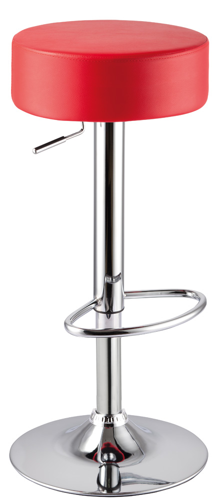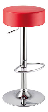 Barová stolička A-042 bez operadla má sedák kruhového tvaru. Sedák je potiahnutý koženkou v červenej farbe a ostatok je v kovovom prevedení vo farbe chrómu.