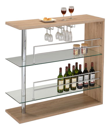 Viacúčelový barový pult je vyrobený z materiálov, ktoré sa navzájom skvele dopĺňaju. Konstrukcia je z fóliovanej DTD vo farbe dreva dub sonoma. Odkladacie poličky sú z tvrdeného číreho skla s hrúbkou 8 mm. Chrómová tyč spája dokopy všetky tieto prvky.