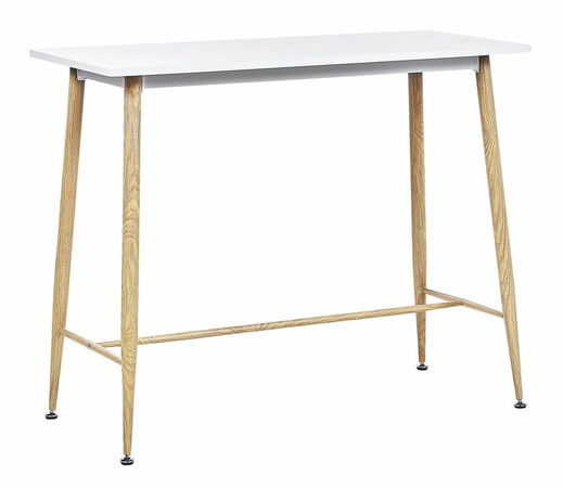 Tento kompaktný stôl v minimalistickom štýle doplní akýkoľvek interiér, malú kuchyňu alebo priestorovo obmedzený jedálenský priestor. Vďaka o čosi vyššej ako štandardnej výške ho možno skombinovať s barovými stoličkami. Biela stolová doska vyrobená z MDF materiálu s lesklou povrchovou úpravou je doplnená kovovými nohami vo farbe svetlého dreva. Nohy stola majú ochranné podložky, ktoré znižujú hluk pri pohybe a chránia podlahu pred poškriabaním.