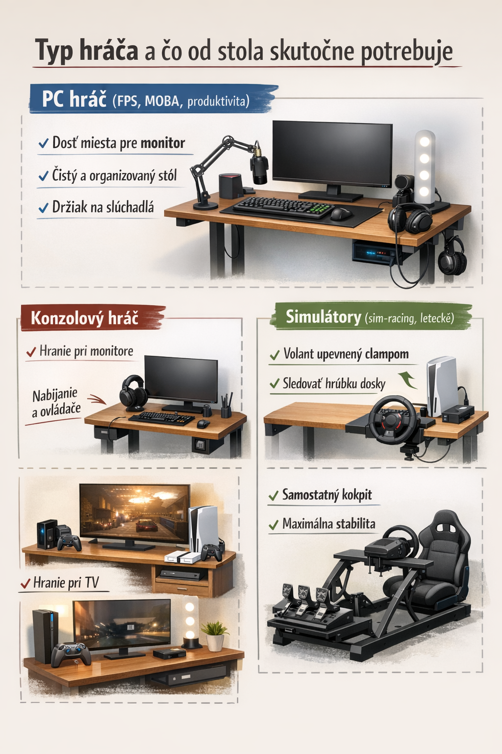 Herný stôl nie je len „doska na PC“. V skutočnosti rieši tri kľúčové veci naraz: ergonómiu (pohodlie a zdravie), priestor (kam sa všetko zmestí) a stabilitu (aby sa nič netriaslo – najmä pri simulátoroch). Práve preto môže byť ideálny stôl pre klasického PC hráča úplne nevhodný pre sim-racera.