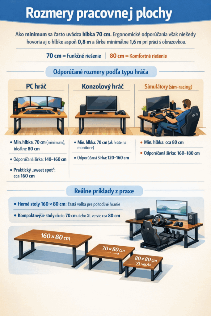 - Herné stoly s rozmermi napríklad 160 × 80 cm často deklarujú práve túto hĺbku kvôli pohodlnej vzdialenosti od obrazovky.