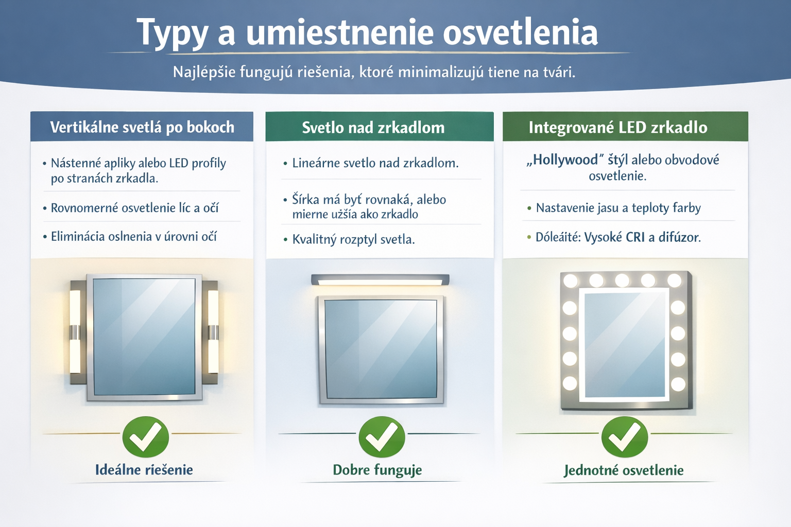 - Lineárne svetlo nad zrkadlom – funguje dobre, ak je dostatočne dlhé a má kvalitný rozptyl. Odporúča sa, aby bolo približne rovnako široké (alebo mierne užšie) ako zrkadlo, nikdy nie širšie.