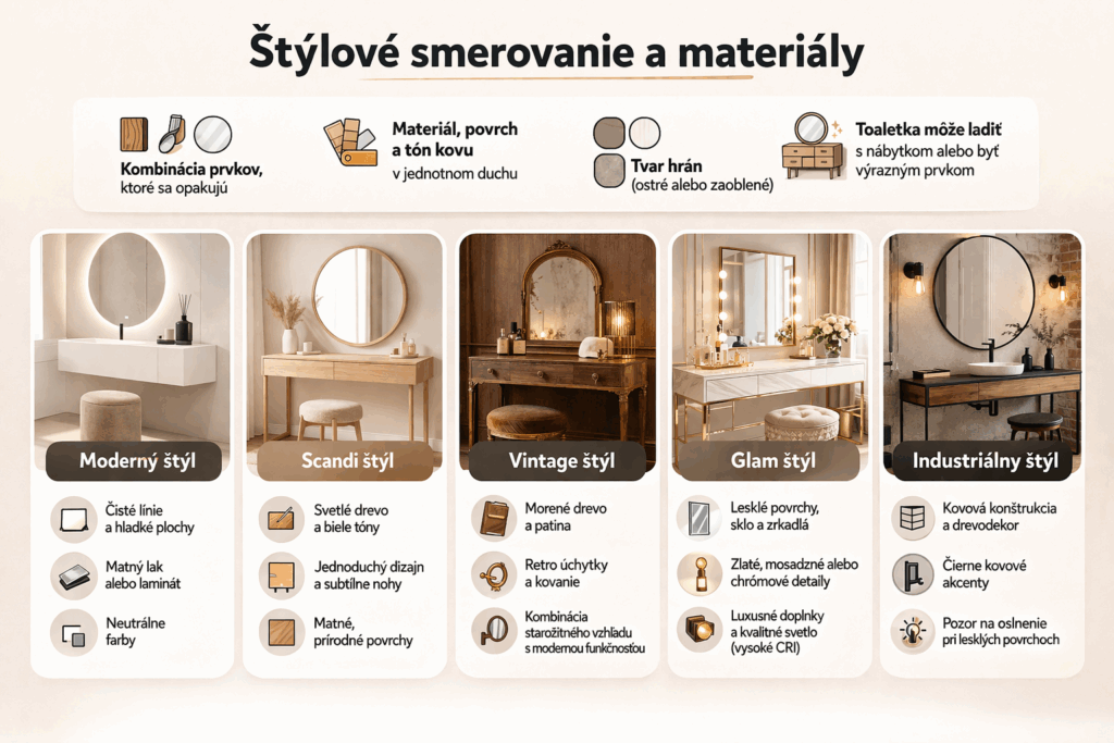 Pri výbere štýlu toaletného stolíka funguje najlepšie jeden princíp: nejde o „nálepku“, ale o kombináciu prvkov, ktoré sa opakujú. Dôležitý je materiál (drevo, kov, sklo), povrch (matný alebo lesklý), tón kovu (čierna, chróm, mosadz) aj tvar hrán (ostré alebo zaoblené).