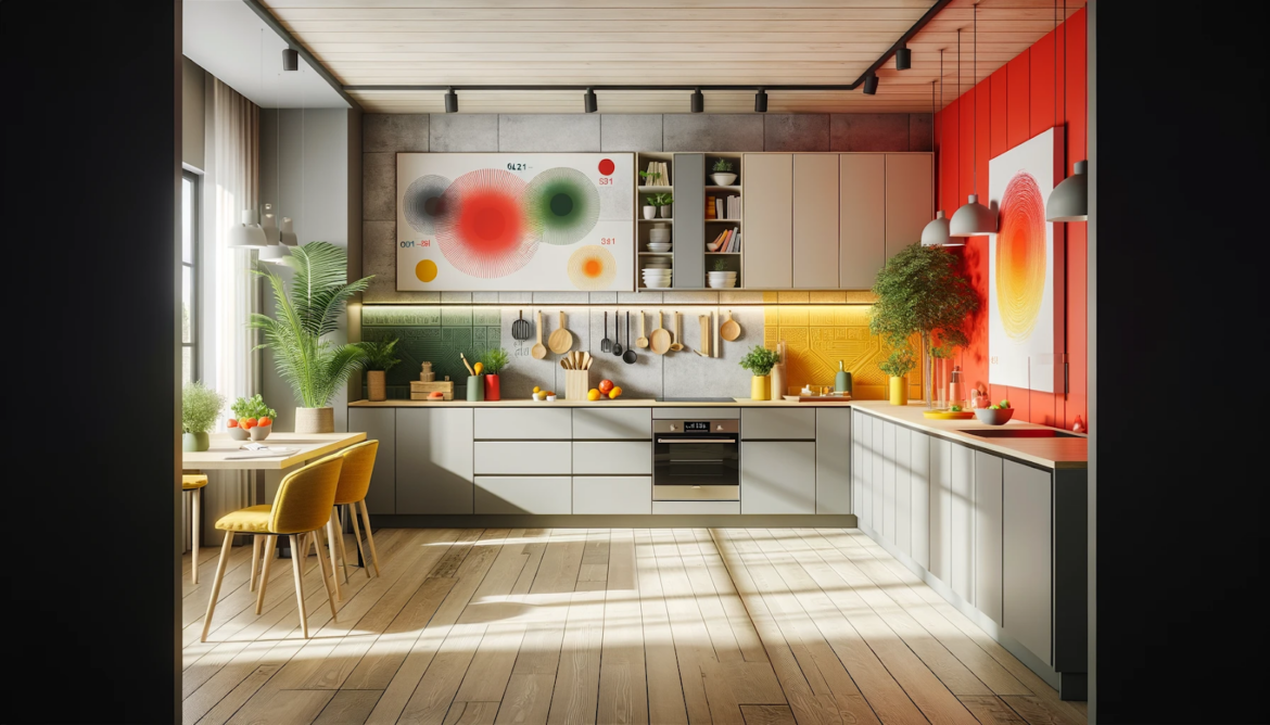 Červená: Táto výrazná farba môže zvýšiť chuť do jedla, čo je ideálne pre jedálenskú časť kuchyne. Avšak v príliš veľkých množstvách môže byť červená stimulujúca a môže spôsobiť nepokoj.