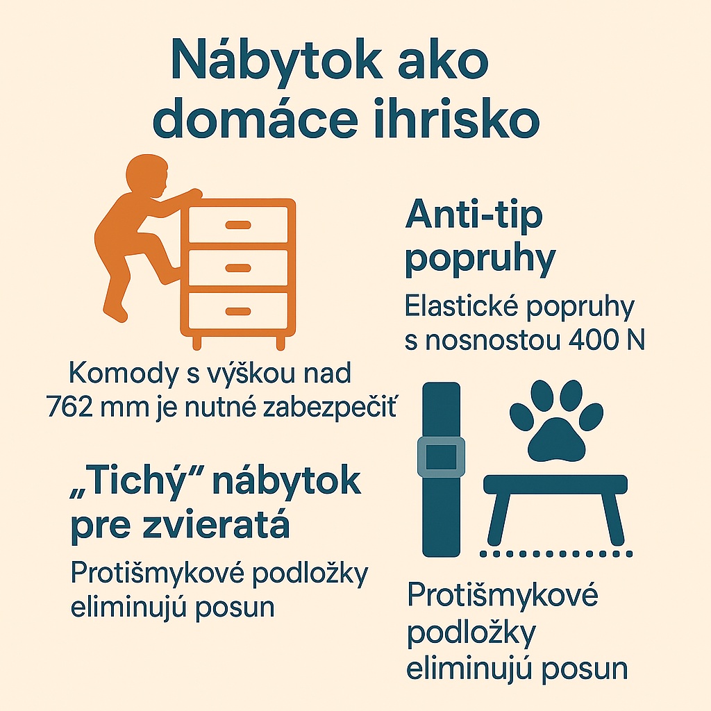 Komody vyššie než 76 cm je nevyhnutné ukotviť k stene a doplniť zarážkami, ktoré zabraňujú vysunutiu viacerých zásuviek naraz, inak sa nábytok pri lezení dieťaťa ľahko prevráti. Elastické anti-tip popruhy udržiavajte stále napnuté; pravidelne skontrolujte, či medzi popruhom a stenou neostala vôľa väčšia než tri milimetre. Ľahké stolíky a skrinky, do ktorých môže naraziť pes alebo mačka, postavte na protišmykové podložky, vďaka čomu zostanú stabilné aj pri náraze s silou okolo 30 N.