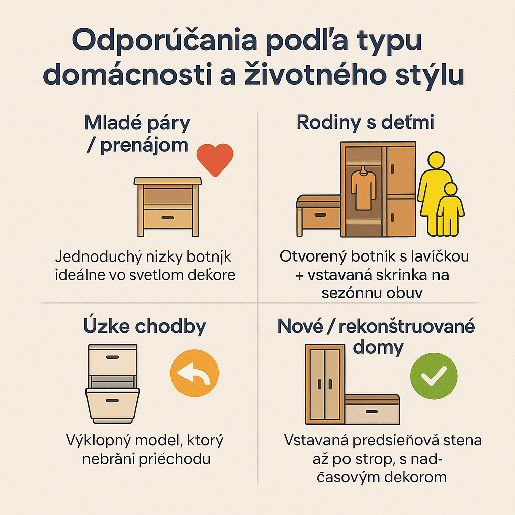 Výber správneho typu botníka závisí od viacerých faktorov: veľkosť priestoru, typ bývania, zloženie domácnosti, očakávaná životnosť nábytku aj estetické preferencie. Na záver preto prinášame konkrétne odporúčania podľa typických scenárov.