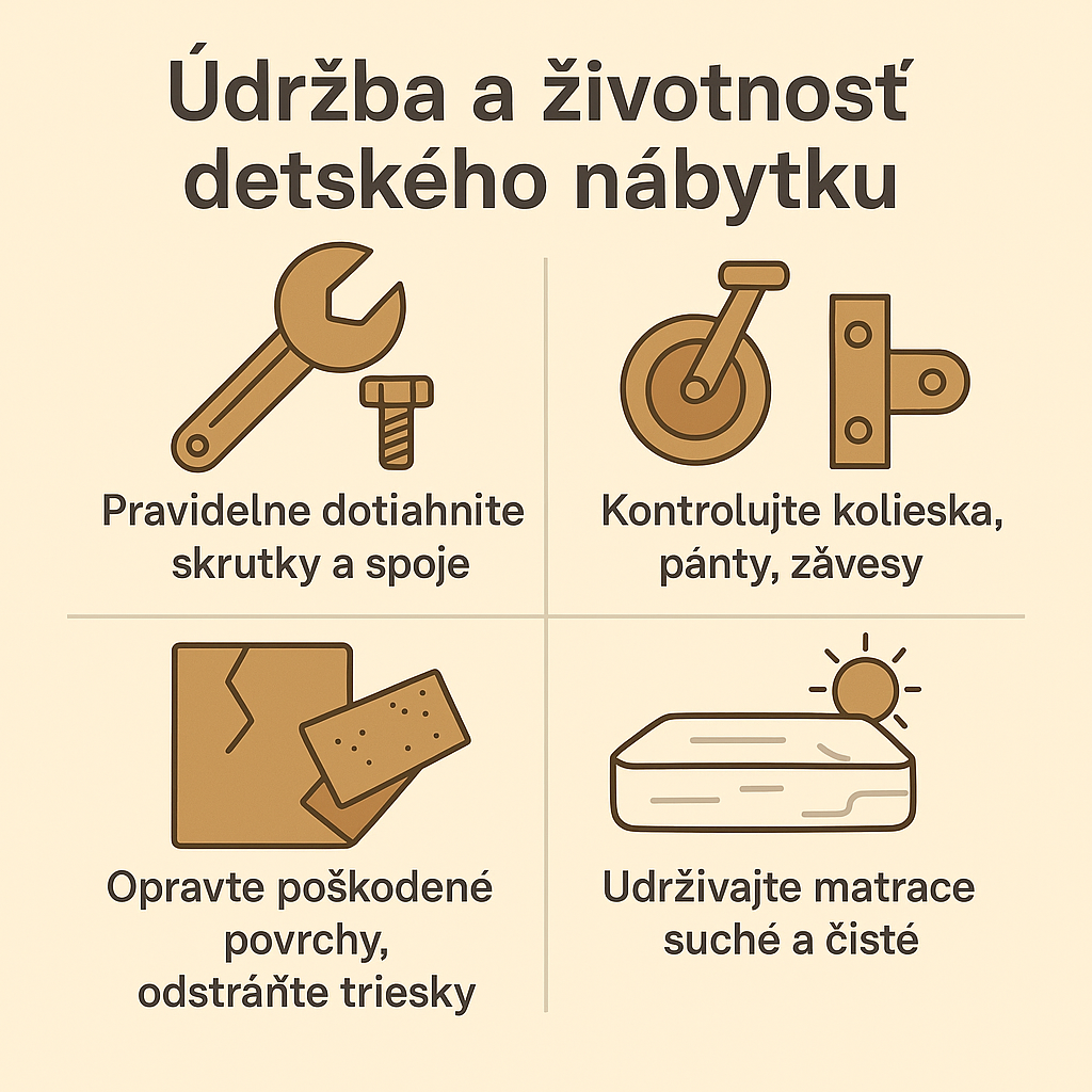 Bezpečnosť detského nábytku nie je daná len jeho kúpou a montážou – treba sa oň správne starať po celý čas používania. Pravidelná údržba predlžuje životnosť nábytku a zabraňuje vzniku nebezpečných situácií v dôsledku opotrebenia. Rodičia by mali aspoň raz za niekoľko mesiacov skontrolovať všetky skrutky, matice a spoje na nábytku a dotiahnuť ich, ak sa uvoľnili. Najmä u postieľok, ohrádok či hojdačiek, kde dochádza k pohybom a otrasom, môže časom dôjsť k povoleniu skrutiek – ak by sa spoj rozpadol, nábytok stratí stabilitu alebo sa rozkýve. Podobne skontrolujte kolieska (či pevne držia), pánty na dvierkach (či sa neuvoľnili) a závesné systémy na nástenných poličkách.