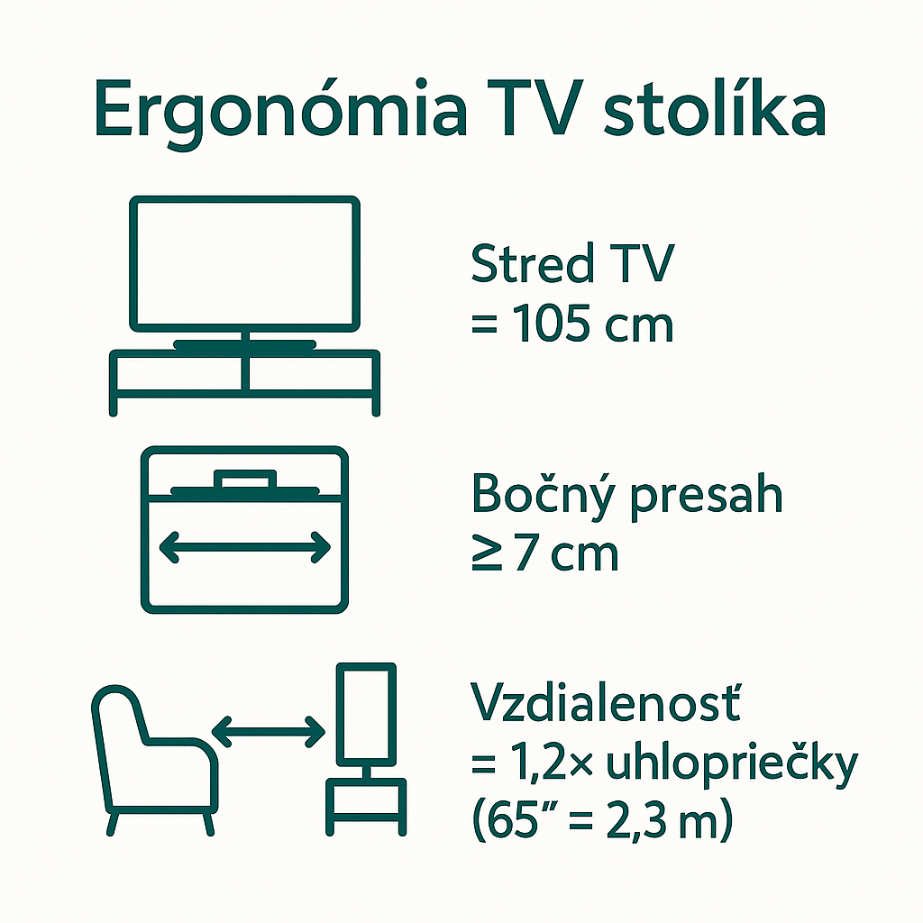 Ergonómovia odporúčajú, aby stred televíznej obrazovky ležal vo výške zorného horizontu sediaceho diváka, čo pre priemernú európsku postavu (výška očí v sede ~105 cm od podlahy) znamená postaviť 55-palcový TV na stolík vysoký 45 – 55 cm (Rahman & Singh, 2022). Štrukturálna analýza uhlopriečok ukázala, že okolo obrazovky by mal zostať minimálne 7 cm bočný presah nábytku, aby sa znížilo neúmyselné zrazenie televízora pri prechode (Hsu & Chen, 2023). Vzdialenosť od diváka sa počíta ako 1,2-násobok uhlopriečky; pre 65″ panel ide asi o 2,3 m (Liu & Wang, 2020).