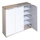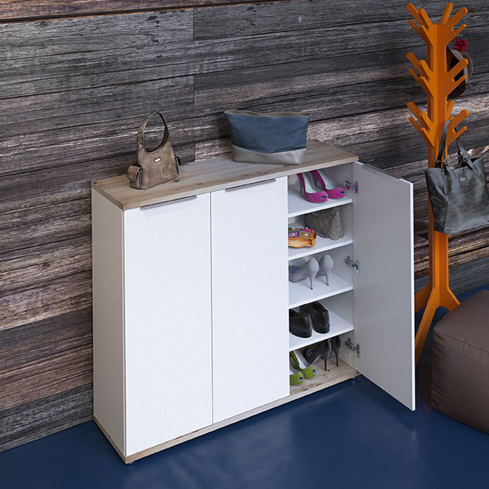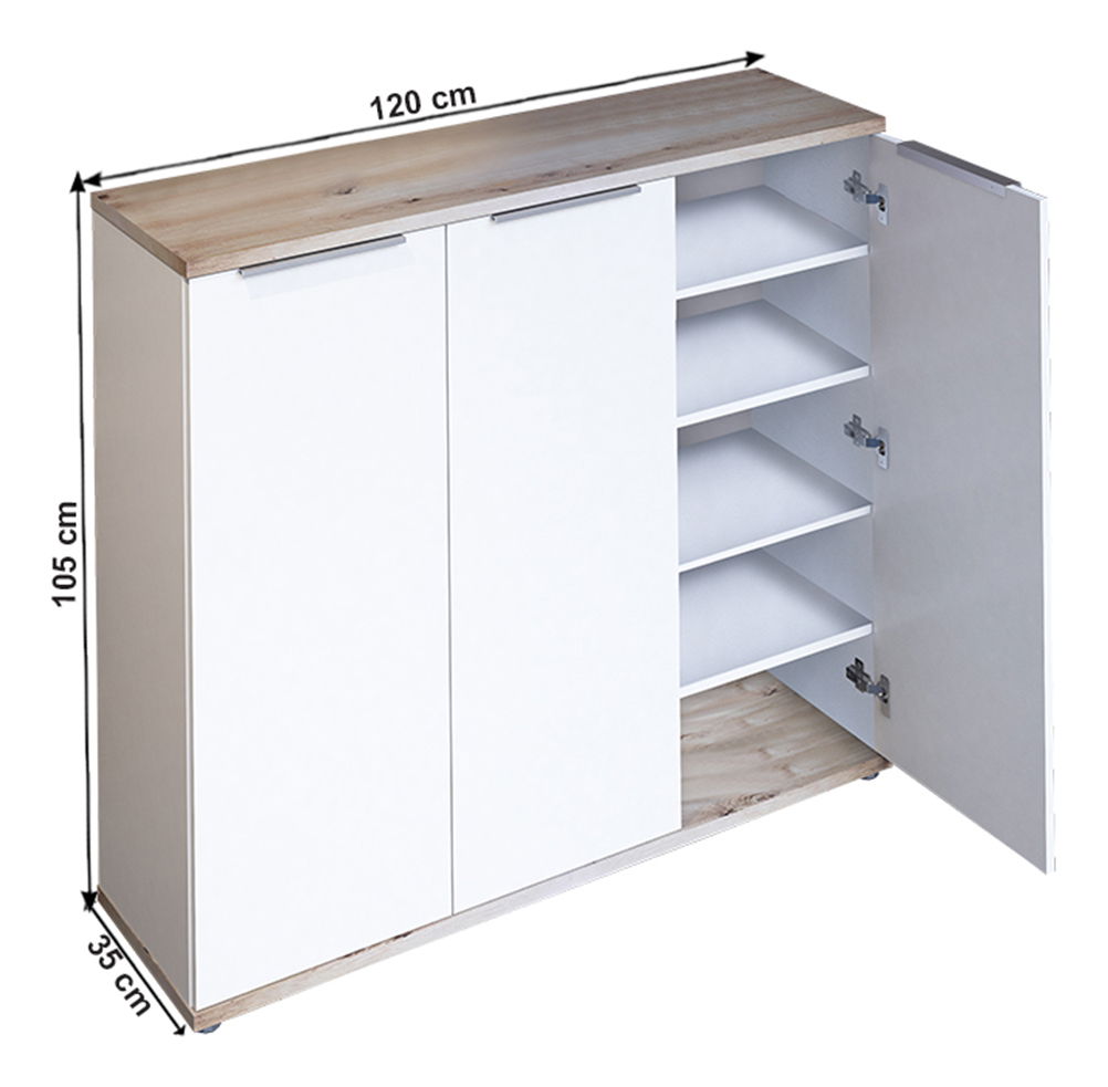 Botník Movyr typ 2 je vyrobený z DTD laminovanej materiálu vo farebnom prevedení biela a dub artisan. Má rozmery 120x35x105 cm a poskytuje dostatok úložného priestoru v podobe troch skriniek s policami. Kovové úchytky a trojdverový dizajn robia z tohto botníka dokonalú kombináciu pre každý interiér. Botník sa dodáva v demonte a jeho hrúbka materiálu je 16/22 mm.