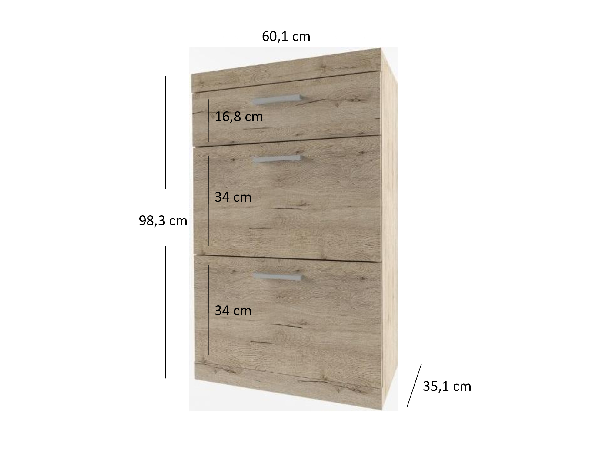Botník ORIT (dub san remo) má výšku 98,5 cm, šírku 60 cm a hĺbku 35 cm. Má laminovanú dosku a ABS hrany s plastovými úchytkami. Nohy sú v balení a poličky majú nosnosť uvedenú v popise. Dodáva sa v dvoch balíkoch s rozmermi 170x38x11,5 cm/15,7 kg a 2100x38x5,5 cm/9,5 kg.