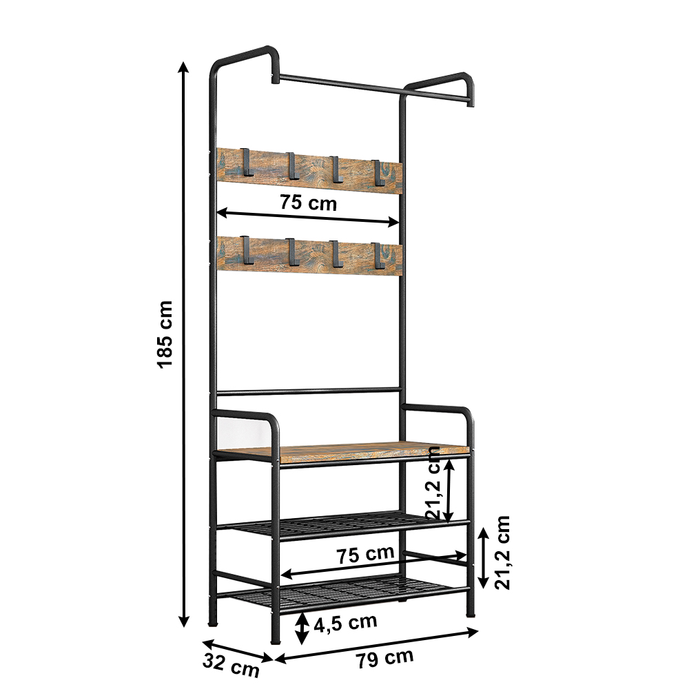 Botník s vešiakom Kalyn (čierna) je moderný a praktický stojan na topánky, ktorý poslúži ako váš nemý sluha. Materiál je kov a MDF. Výška od zeme po spodnú časť police je 4,5 cm a rozmery police sú v. 21,2 cm, š. 75 cm. Hrúbka tyčí je 1,9 cm a 1,3 cm, nosnosť na policu je 5 kg a na vešiakovú časť 2 kg. Dodáva sa v demonte.