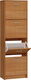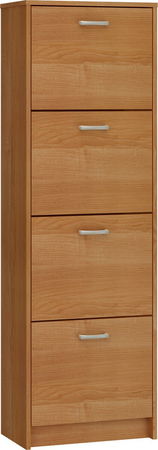 Elegantný vysoký a úzky botník (alebo skrinka) do určený do Vašej predsiene. Botník sa skladá zo 4 výklopných zásuviek. Stredná pozdĺžna drevená oddelovacia priečka vo výklopnej zásuvke je odnímateľná s cieľom zväčšiť objem pre rozmernejšie topánky, napríklad v zimnom období. Svojím rozmerom je použiteľný na viac párov topánok. Dodáva sa vo farebnom prevedení jelša alebo buk.