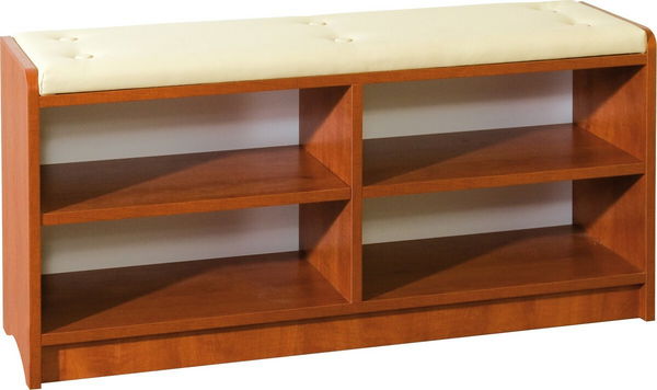 Krásna čalúnená lavička so štyrmi otvorenými poličkami na topánky slúži zároveň aj ako botník. Čalúnenie je v svetlej farbe.