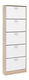 Vysoký botník, ktorý nájde využitie najmä v menších priestoroch bytov a domov. Celkovo ponúka päť priečinkov s výklopnými dvierkami. Tie ponúkajú dostatok priestoru pre uloženie Vašich topánok. Je vyrobený z laminovanej DTD v kombinácii farieb dreva dub sonoma a bielej.