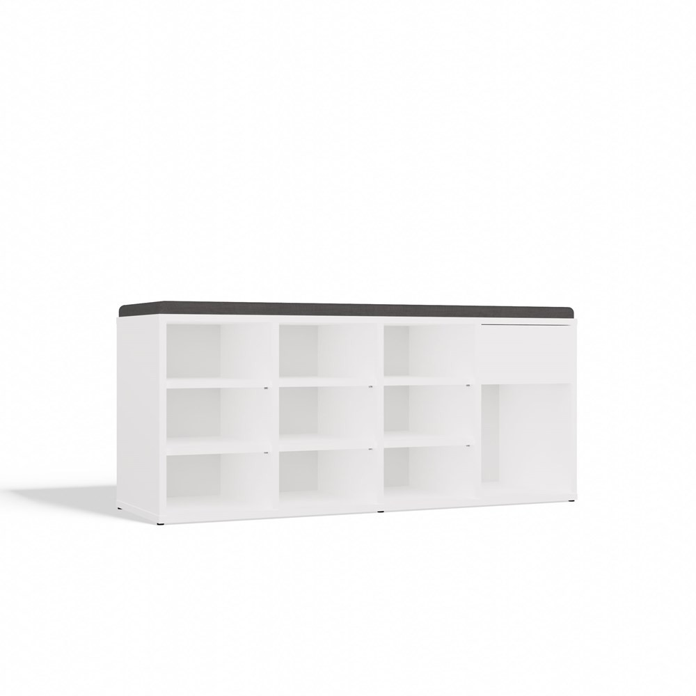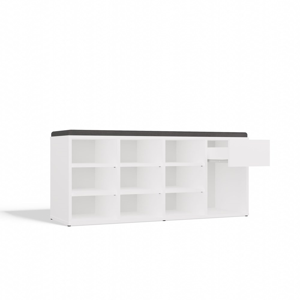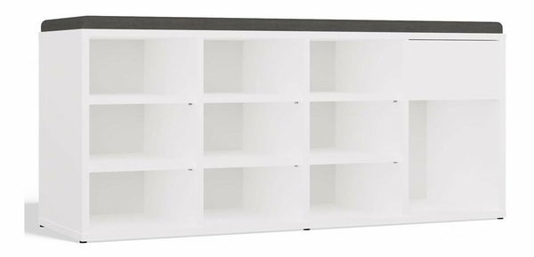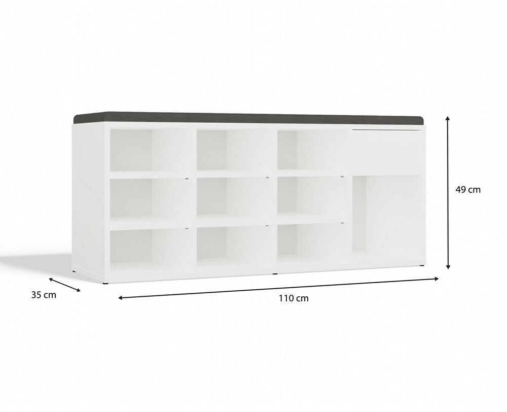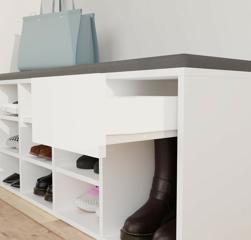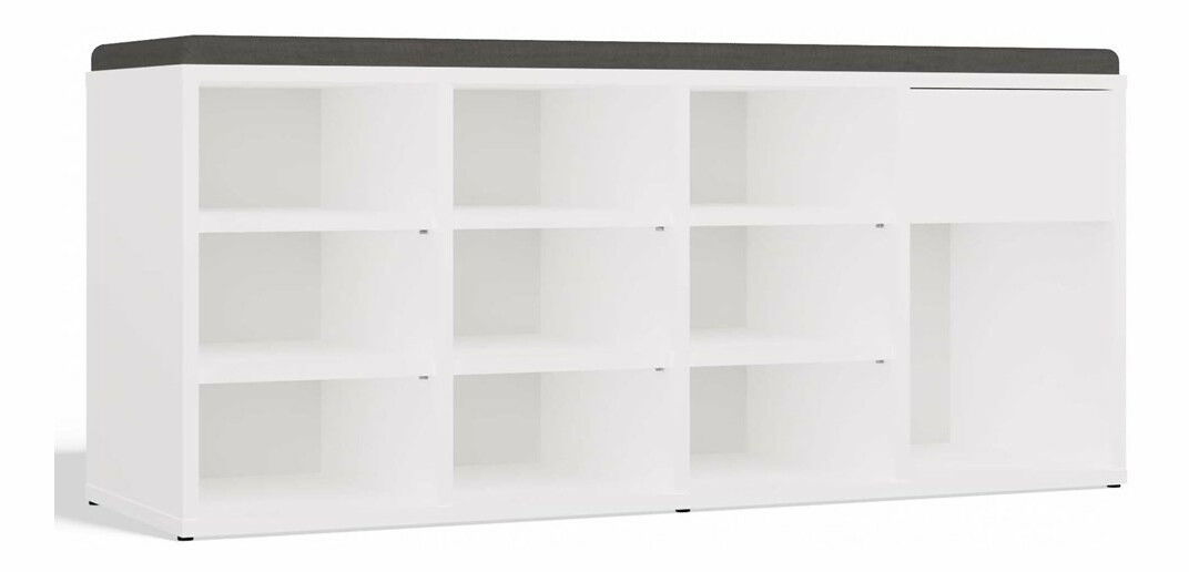 Botník Telos 1 je praktickým a estetickým riešením do každého predsiene, ktorý kombinuje pohodlie s dostatkom úložného priestoru. S bielou farbou a moderným dizajnom sa skvele hodí do rôznych interiérov. Tento nábytok ponúka až 9 otvorených priehradiek na obuv, praktickú zásuvku na drobnosti a vysokú komoru, ideálnu na uskladnenie vyšších topánok či doplnkov. Tapicerované sedenie zabezpečuje komfort pri obúvaní, zatiaľ čo stabilná konštrukcia z laminovanej dosky zaručuje dlhú životnosť. Telos 1 je ideálnym doplnkom pre organizáciu vašich topánok a príslušenstva.