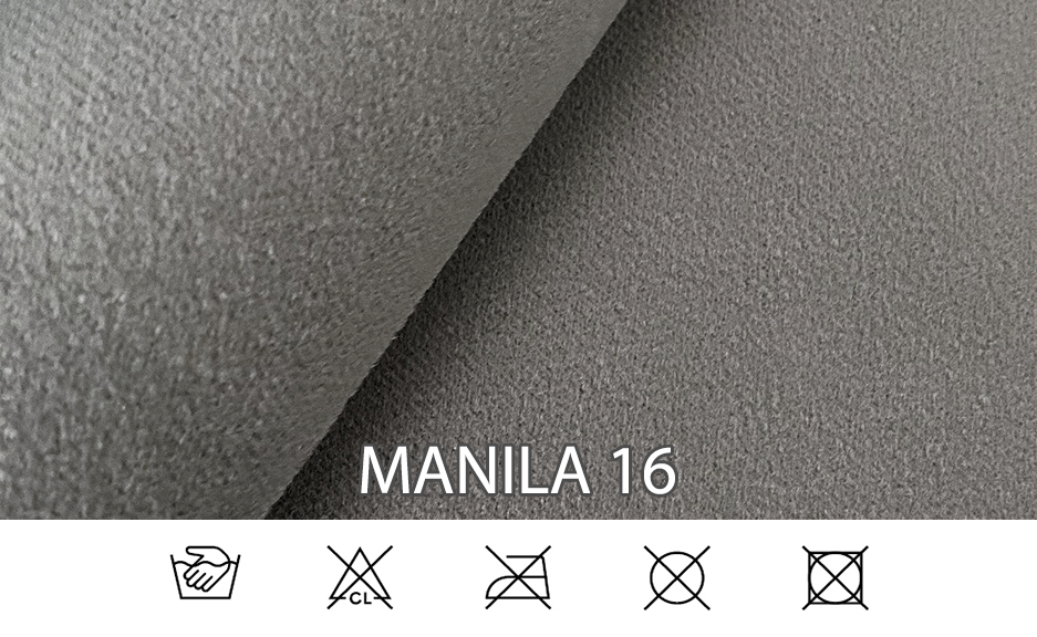Manila je látka so štruktúrou, ktorá je jemná a zamatová na dotyk. Patrí do skupiny plyšových látok, ktoré skvele vyzerajú na čalúnenom nábytku. Je trvácna, odolná voči treniu a oderu. Počas používania nevybledne a nežmolkuje sa. Má nehorľavé vlastnosti. Tkaninu je možné prať ručne pri nízkych teplotách. Zloženie: 100% polyester. Gramáž: 220g/m² +/- 5%.