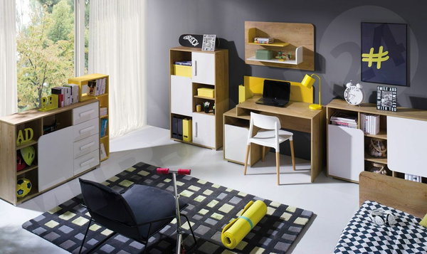 Nábytok do detskej izby sa skladá z komody s nadstavcom, menšej a väčšej komody, police a PC stolíka.
