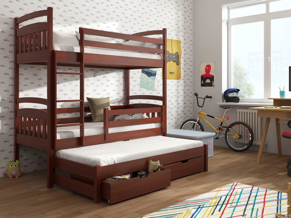 Poschodové postele predstavujú racionálne využitie miestnosti a znásobenie funkcie detskej izby. Sú obľúbené najmä v menších bytoch, kde treba využiť priestor čo najlepšie. Poschodová posteľ Anie ponúka možnosť na prespanie až trom deťom. Všetky tri lôžka sú plnohodnotné a po umiestnení vhodného matraca zaručujú deťom pohodlný spánok. Horné aj stredné lôžko majú praktickú bariérku, ktorá zabraňuje spadnutiu dieťaťa. Spodné lôžko je umiestnené na kolieskach, pomocou ktorých ho jednoducho vysuniete alebo zasuniete. Pod ním sa nachádzajú ešte dve zásuvky, do ktorých si deti môžu uložiť svoje hračky. Prístup na horné lôžko je zabezpečený pomocou rebríka.