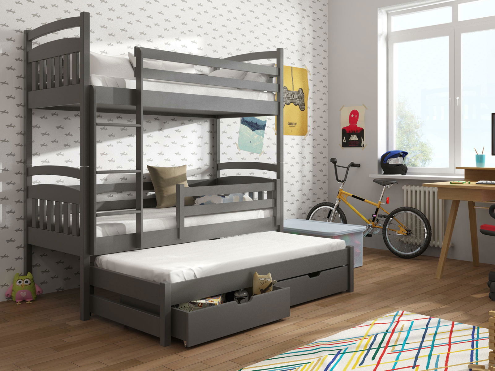 Detská poschodová posteľ Anie (grafit) (s roštami) je ideálna voľba pre menšie detské izby, kde je potrebné využiť priestor čo najlepšie. Posteľ ponúka možnosť pre prespanie až trom deťom a všetky tri lôžka sú plnohodnotné a zaručujú pohodlný spánok. Horné aj stredné lôžko majú praktickú bariérku, ktorá zabraňuje spadnutiu dieťaťa. Spodné lôžko je umiestnené na kolieskach a pod ním sa nachádzajú dve zásuvky, kde si deti môžu uložiť svoje hračky. Prístup na horné lôžko je zabezpečený pomocou rebríka. Posteľ je vyrobená z borovicového dreva, rám je celý z borovicového dreva a matracový rám je vyrobený z brezového FLEX pásu. V cene postele nie je zahrnutá cena matraca. Postele sú vyrobené v súlade s normou EN-747-1:2012+A1:2015, čo zaručuje najvyššie bezpečnostné štandardy pri výrobe detských postelí. Posteľ je vyrobená z FSC 100% certifikovaných zdrojov, ktoré zaručujú, že drevo pochádza zo zodpovedného lesného hospodárstva.