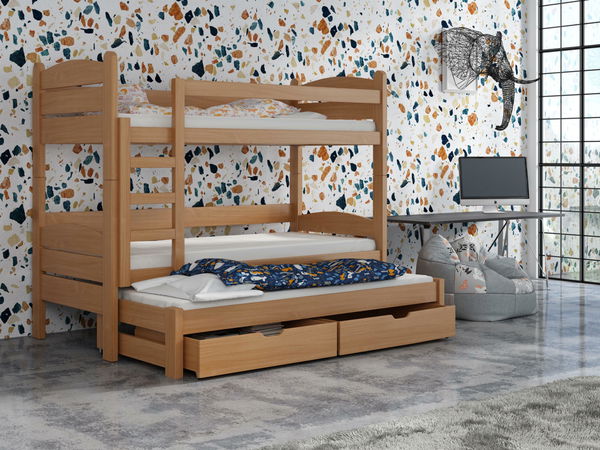 Detské poschodové postele šikovne riešia problém nedostatku miesta v detskej izbe. Posteľ Celsa je primárne pre dve deti, ale v prípade návštevy môžete vysunúť spodné lôžko, čím dostanete plnohodnotnú tretiu posteľ. Pomocou rebríka sa dieťa jednoducho dostane na horné lôžko. Dve výsuvné zásuvky na kolieskach ponúkajú úložný priestor na hračky alebo posteľné prádlo.