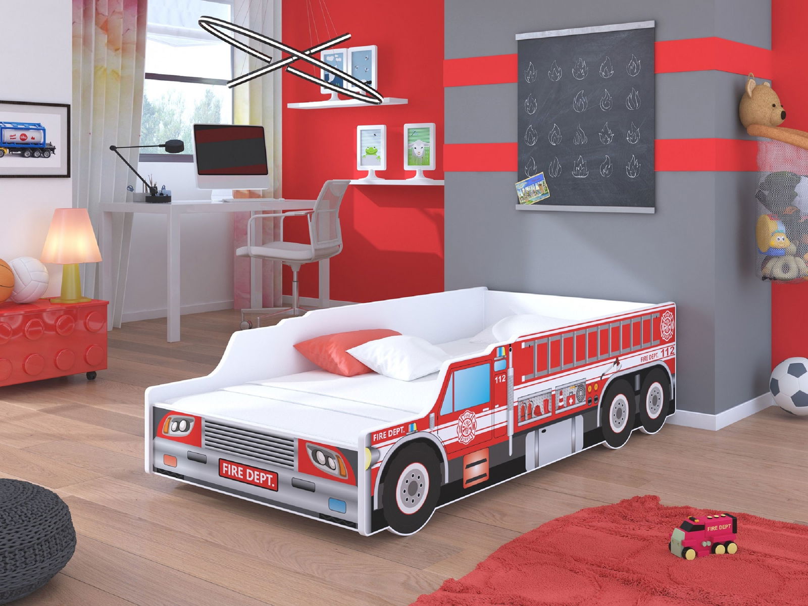Detská posteľ s názvom POŽIARNIK v červenej farbe je v tvare požiarnického auta a je vyrobená z kvalitnej MDF dosky s ABS hranami. S rozmermi 140x70 cm poskytuje pohodlný spánok a je vybavená roštom s pružnými lamielami a penovým matracom s odnímateľným poťahom na zips. Posteľka má bariéru proti spadnutiu a je určená pre deti, ktoré sa chcú stať hrdinskými hasičmi a mať nekonečné dobrodružstvá. Posteľka obsahuje unikátne detaily a posilňuje predstavivosť a herné schopnosti detí.
