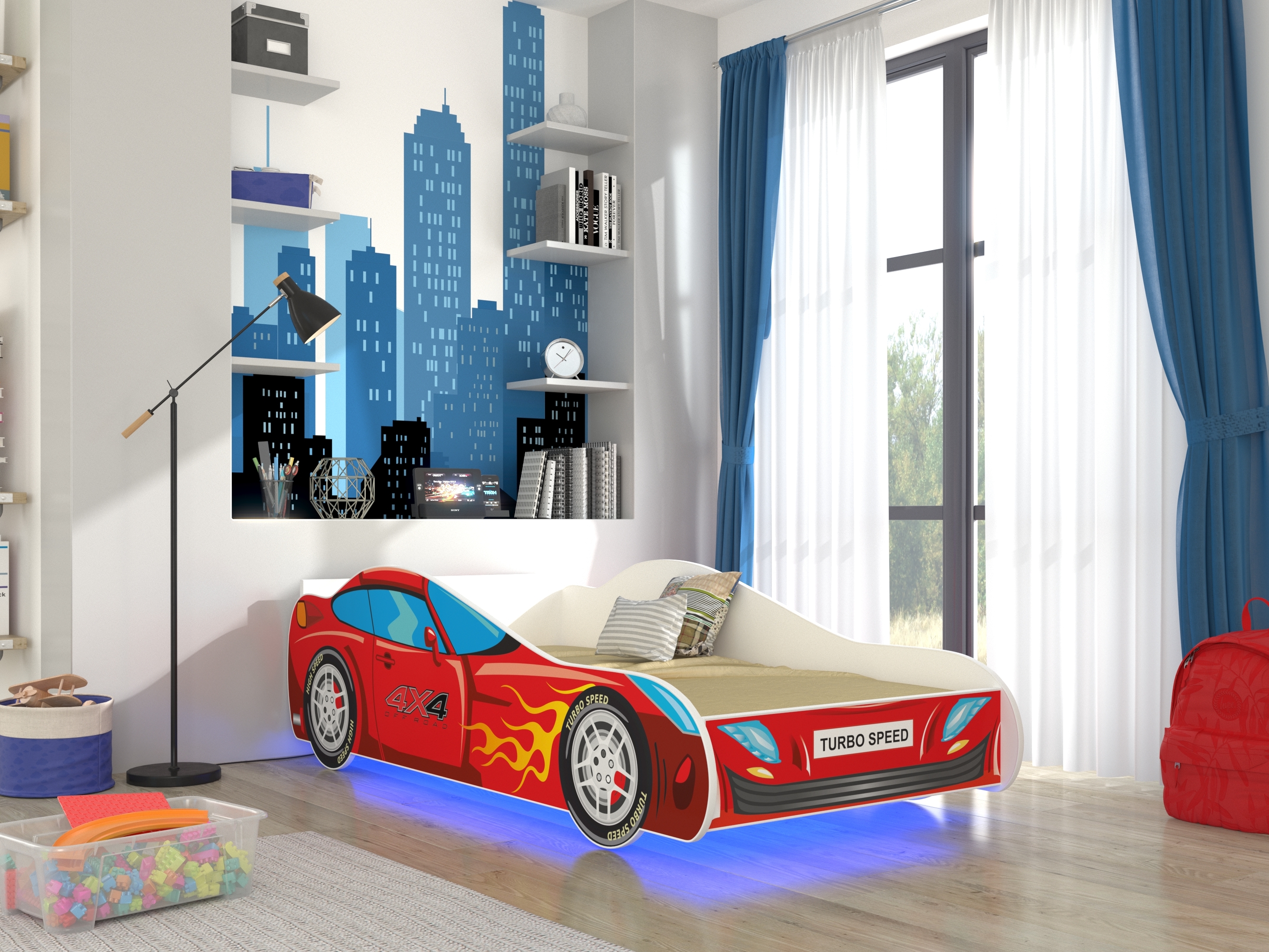 Detská posteľ 140x70 cm Pretekár (s roštom a matracom) je vyrobená ako pretekárske autíčko z MDF dosky s ABS hranami a má výšku 48 cm, šírku 74 cm a dĺžku 153 cm. S nosnosťou 110 kg je dostatočne stabilná aj pre hravé deti. Posteľ je vybavená roštom v systéme Flex a penovým matracom s odnímateľným poťahom na zips pre ľahké udržiavanie a čistenie. Bariéra proti spadnutiu zabezpečuje bezpečnosť a ochranu detí. Okrem toho, posteľka má aj LED osvetlenie, ktoré pridáva atmosféru do izby a vytvára zábavné prostredie pre deti. Táto posteľka je dodávaná v balíku so základnou farbou červenou.