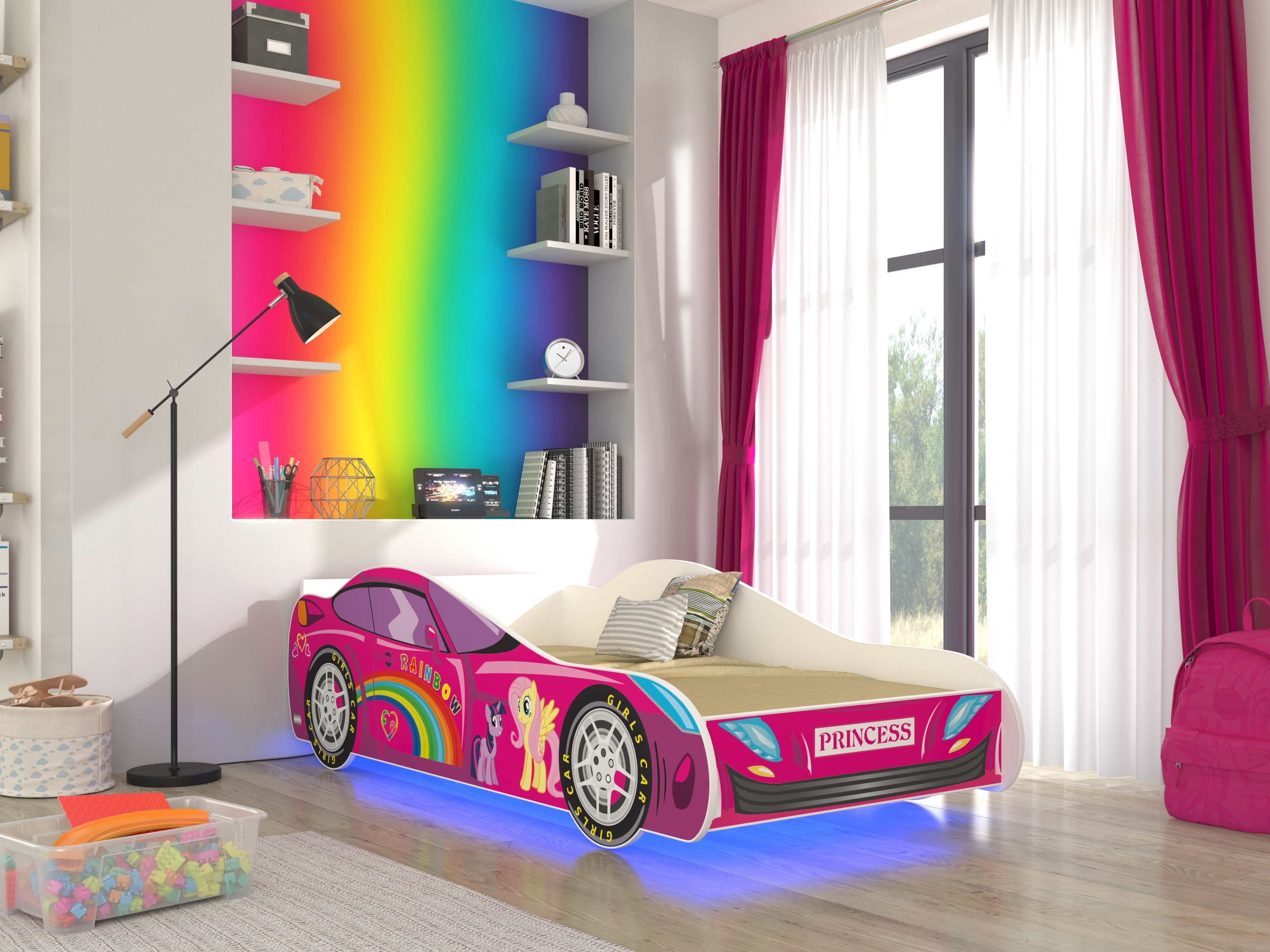 Detská posteľ 140x70 cm Pretekárka (s roštom a matracom) (ružová) je vyrobená z MDF dosky s ABS hranami, ktoré poskytujú pevnosť a odolnosť voči každodennému používaniu. Rošt je vyrobený z pružných lamiel v systéme Flex, matrac je penový s odnímateľným poťahom na zips. Bariéra proti spadnutiu zabezpečuje bezpečnosť a ochranu vášho dieťaťa počas spánku. LED osvetlenie pridáva atmosféru do detskej izby. Táto posteľka je dostatočne stabilná aj pre živé a hravé deti s nosnosťou až 110 kg. Vo výrobnom procese sa používajú ekologické vodové farby, ktoré sú bezpečné pre deti a odolné voči mechanickému poškodeniu.