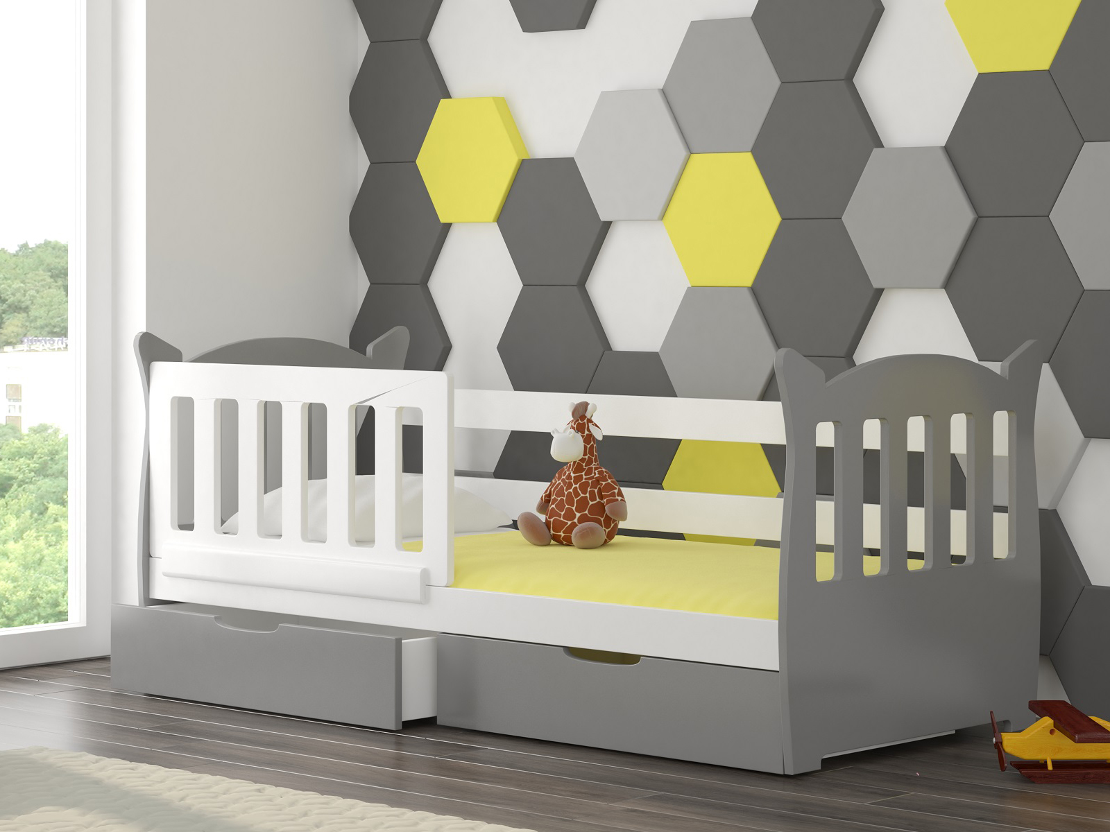 Detská posteľ Lenka má rozmery 160x75 cm a výšku 75 cm. Jej konštrukcia je vyrobená z kvalitnej MDF dosky, ktorá zabezpečuje pevnosť a odolnosť. Posteľka obsahuje aj rošt a špeciálny penový matrac s odnímateľným poťahom na zips, ktorý sa ľahko udržiava v čistote. Dve vysúvacie zásuvky na gumených kolieskach poskytujú dostatok úložného priestoru pre hračky a oblečenie. Posteľka má aj bariéru proti spadnutiu so zaoblenými hranami a čelami v tvare ušiek, čo prináša bezpečie a hravý dizajn. Výroba posteľky používa ekologické vodové farby bezpečné pre deti a odolné voči mechanickému poškodeniu. K baleniu prislúcha príslušenstvo na montáž a montážny návod.