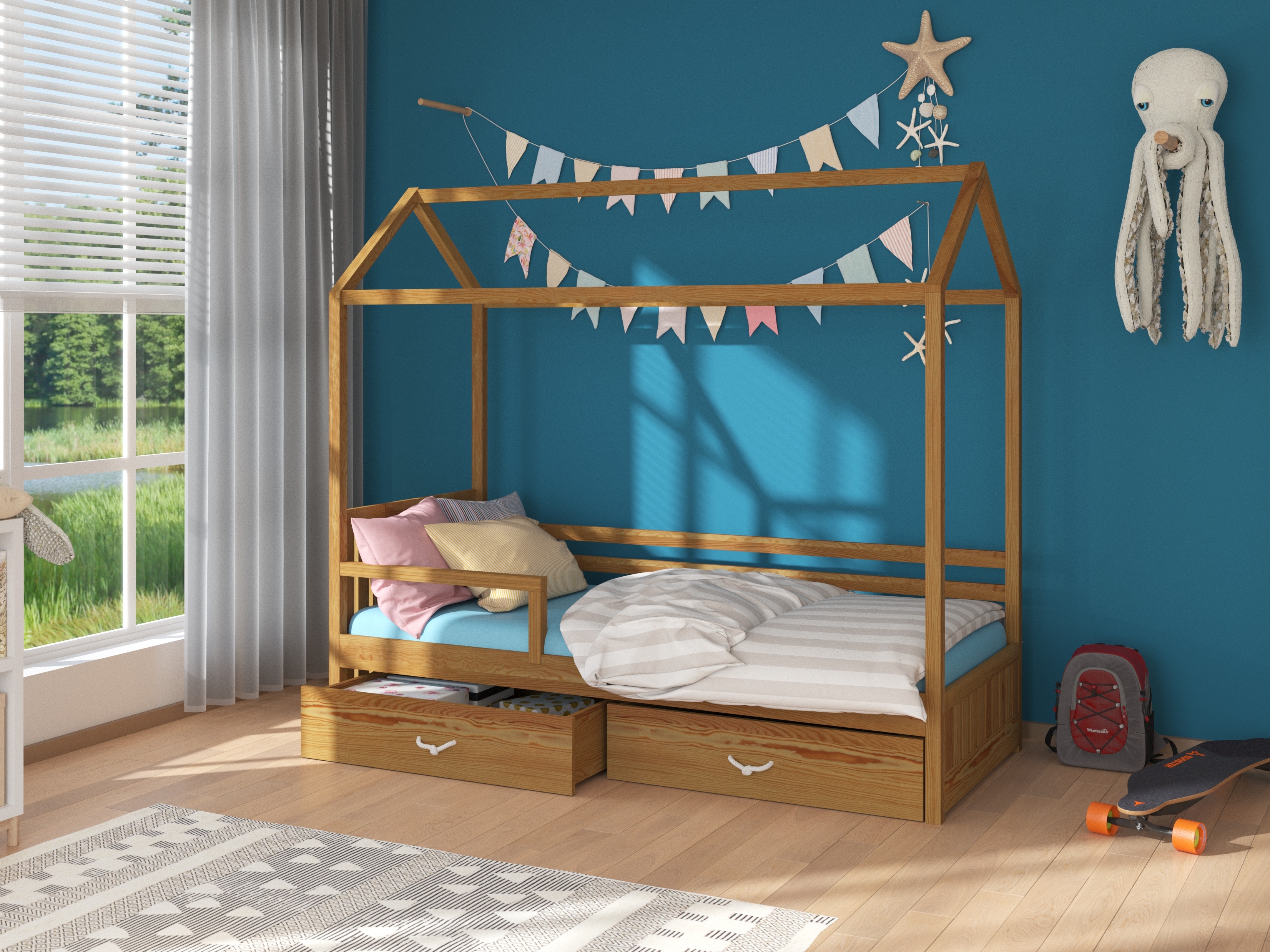 Detská posteľ 180x80 cm Rosie II (s roštom) (dub) je vyrobená z kvalitného borovicového dreva spojeného s laminovanou doskou. Táto postieľka je pevná a šarmantná a ponúka dokonalý komfort a odpočinok vašej malej hviezde. Disponuje aj praktickým úložným priestorom v podobe dvoch vysúvacích zásuviek, a bariérou proti spadnutiu, ktorá zabezpečuje bezpečnosť a istotu. Posteľka ROSIE má plochu na spanie 80x180 cm a je vybavená roštom z borovicového dreva. Príslušenstvo na montáž a montážny návod sú súčasťou balenia, ktorého váha je 53 kg.