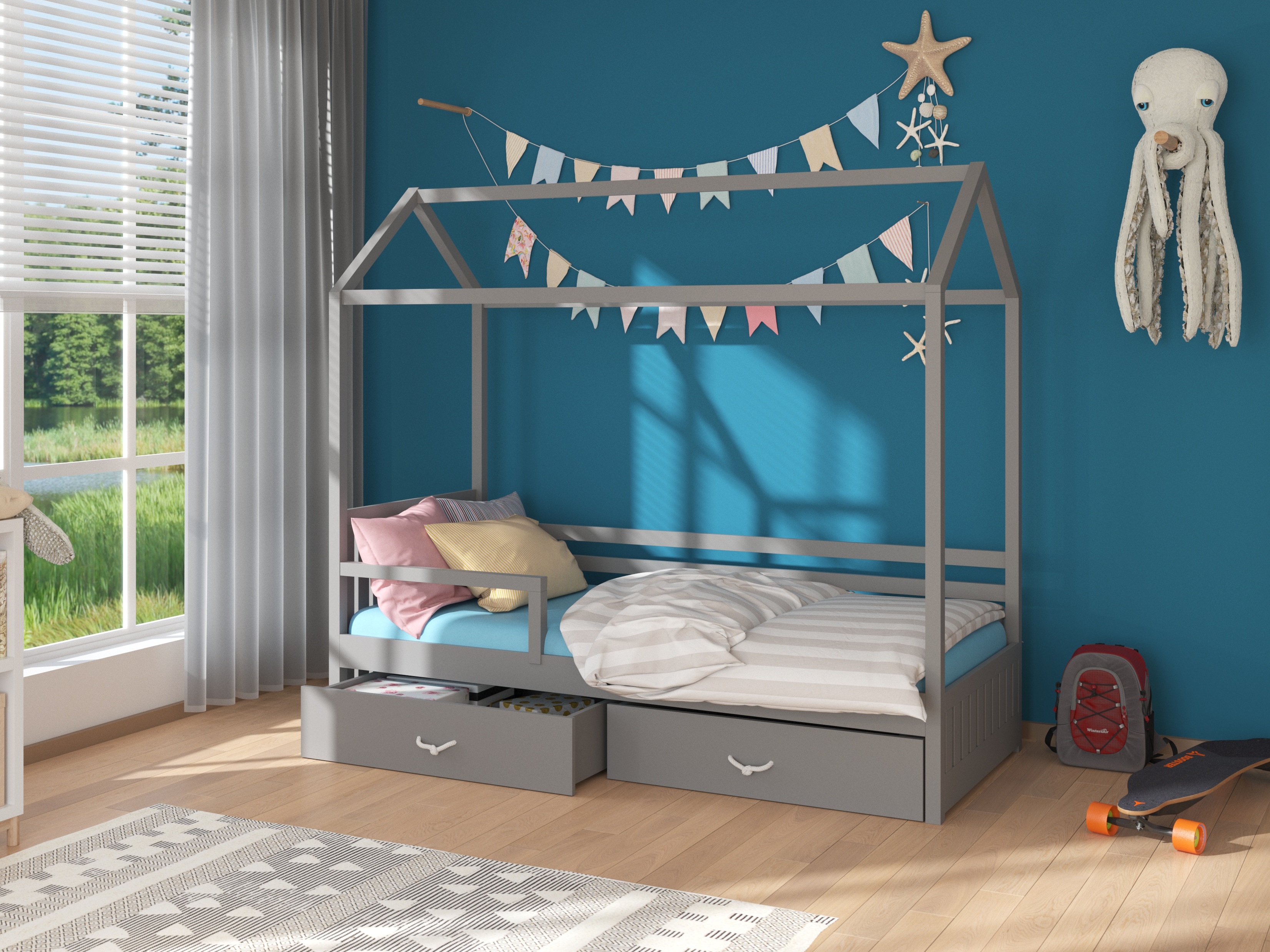 Detská posteľ ROSIE II s roštom má veľkosť 180x80 cm a je vyrobená z kvalitného borovicového dreva spojeného s laminovanou doskou. Posteľka má dva vysúvacie priestory na uskladnenie hračiek, oblečenia a ďalších vecí, ako aj bariéru proti spadnutiu, ktorá zabezpečuje bezpečný spánok pre vaše dieťa. S plochou na spanie 80x180 cm poskytuje dostatok priestoru pre bezstarostné sny a hravé dobrodružstvá. Balenie obsahuje príslušenstvo na montáž a montážny návod, rozložené do štyroch balíkov.