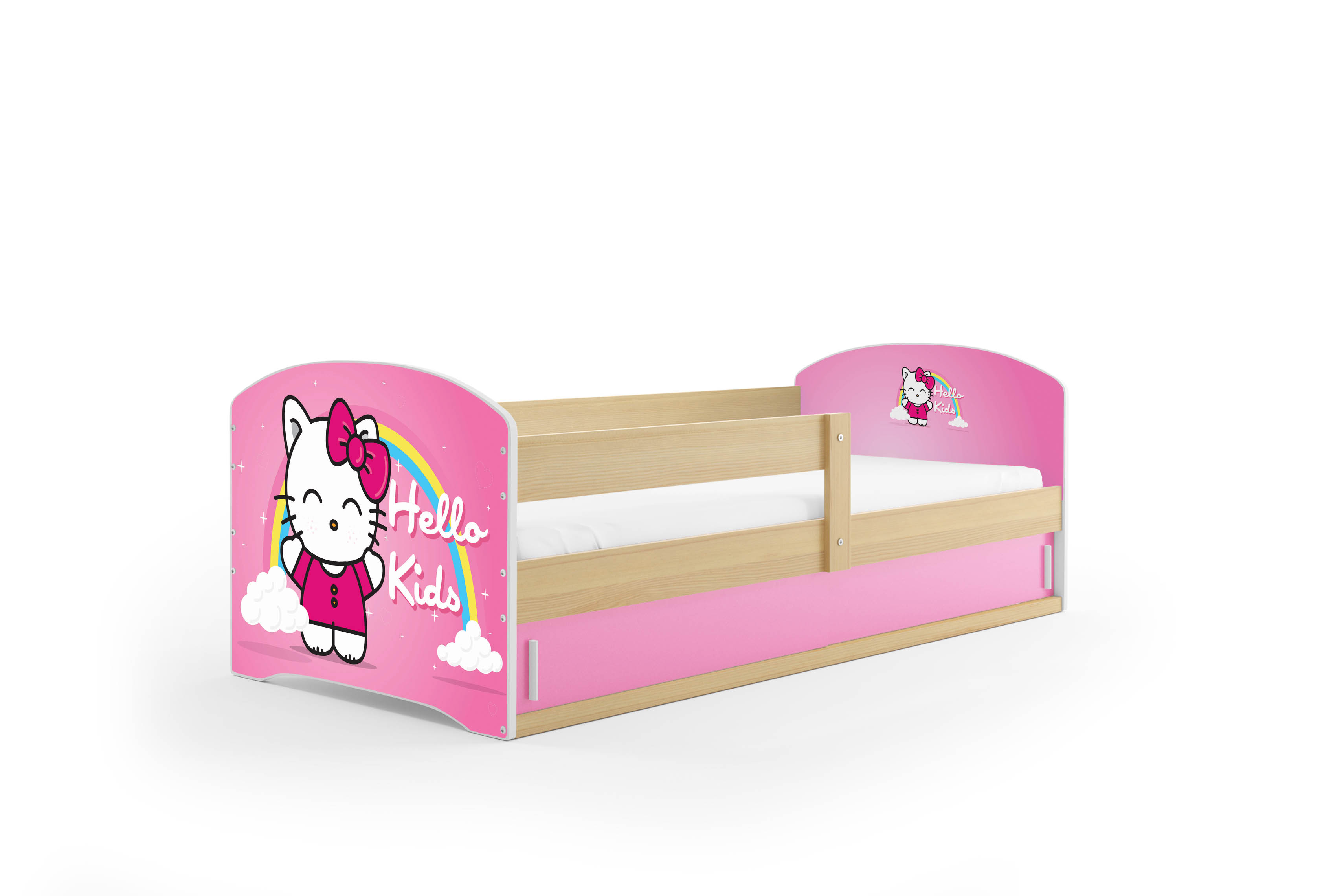 Detská posteľ 80 x 160 cm Lukan (borovica + vzor hello kids) (s roštom, matracom a úl. priestorom)