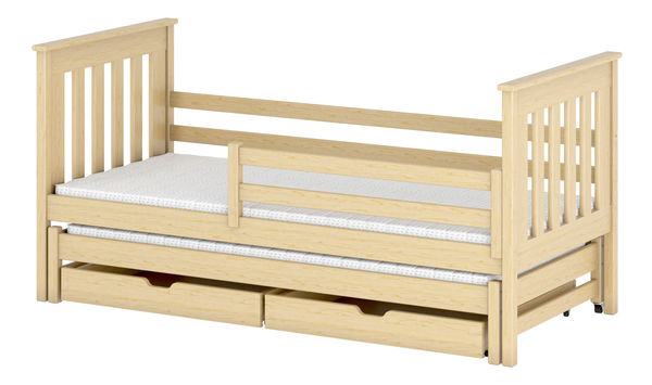 Rozkladacia posteľ Toya je nižšia posteľ určená najmä pre deti, napríklad pre dvoch súrodencov. Posteľ je zvlášť vhodná pre malé deti. Horné lôžko má okolo rámu bariéry. Bariéry chránia dieťa pred vypadnutím z postele. Bariéry je možné kedykoľvek odmontovať. Spodné lôžko je umiestnené pod horným a dá sa jednoducho vytiahnuť a pripraviť na spanie. Posteľ nezaberá veľa miesta a hodí sa do menších detských izieb. K dispozícii je aj praktický úložný priestor, kam si môžete uložiť posteľnú bielizeň alebo hračky.
