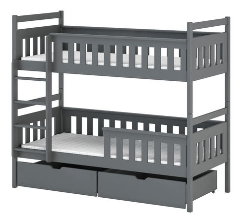 Detská posteľ Tommy s roštom a úložným priestorom je štýlová poschodová posteľ pre dve deti. Je vyrobená z masívnych borovicových dosiek a má ochranné bariéry zabraňujúce vypadnutiu z postele. Posteľ je ideálna pre menšie izby, pretože šetrí priestor. Vzdialenosť medzi lôžkami je 68 cm a výška od zeme po horné lôžko je 115 cm, zatiaľ čo výška od zeme po spodné lôžko je 35 cm. Posteľ má štvorcové nožičky zabezpečujúce stabilitu a úložný priestor. Matrac nie je súčasťou postele, ale môžete si ho vybrať a priobjednať. Posteľ je vyrobená v súlade s najvyššími bezpečnostnými štandardmi pre detské postele a farby sú bezpečné pre deti.