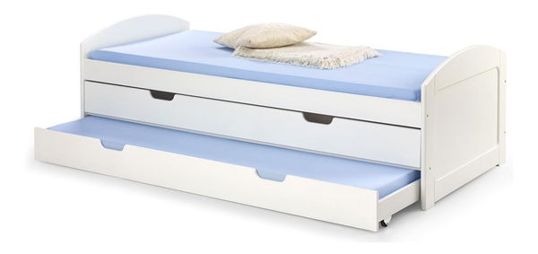 Detská posteľ rozkladacia s dvoma lôžkami a úložným priestorom v strede. Posteľ je vybavená roštami. Inšpirujte sa bielou a dodajte detskej izbe šmrnc. Štýlová rozťahovacia posteľ bude ideálnym spečatením detských kamarátstiev.