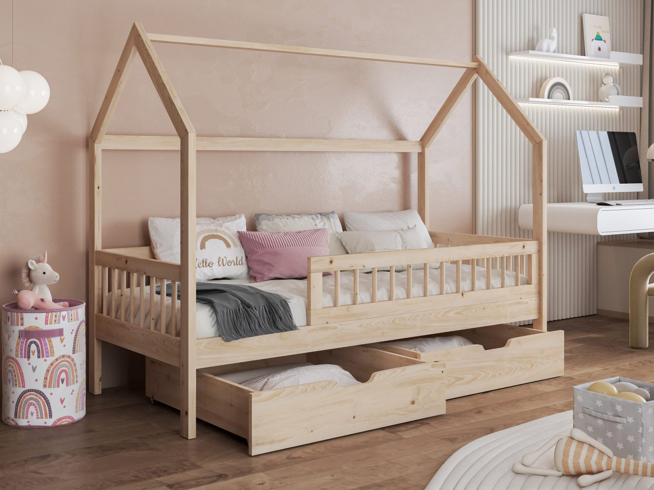 Izbička pre malého človiečika, vybavená detskou posteľou Potako 80, je miestom oddychu a rozvíjania fantázie a kreativity už od útleho veku. Celá konštrukcia je vyrobená z masívneho borovicového dreva. Vo farebných variantoch dominujú jemné a univerzálne odtiene, ktoré dobre poslúžia v chlapčenských aj dievčenských priestoroch. Bezpečné používanie zaisťuje detská posteľ so zábradlím, ktoré možno nainštalovať podľa vlastného uváženia. Ďalším praktickým doplnkom je úložný priestor v podobe dvoch zásuviek na kolieskach, ktoré sa posúvajú po podlahe. Je to perfektné miesto pre paplóny a vankúše, ako aj rôzne detské doplnky. S týmto modelom zariadite prakticky každú detskú izbu.