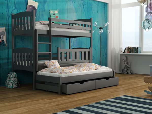Poschodová posteľ Anja je vysoká posteľ pre 3 menšie deti, ktorá je vhodná aj do menších izbičiek, kde je potrebné šetriť priestorom. Posteľ má dodatočnú ochranu vo forme bariér. Na hornom lôžku sú bariéry pevne pripevnené, zo spodného lôžka sa dajú bariéry odmontovať. Výška medzi jednotlivými lôžkami je 75 cm. Tretie lôžko sa nachádza pod spodným lôžkom a dá sa jednoducho vysunúť. K dispozícii je aj úložný priestor v podobe dvoch zásuviek.