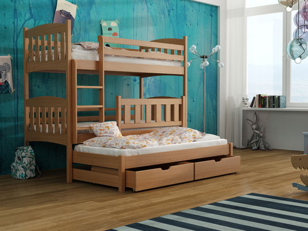 Poschodová posteľ Anja je vysoká posteľ pre 3 menšie deti, ktorá je vhodná aj do menších izbičiek, kde je potrebné šetriť priestorom. Posteľ má dodatočnú ochranu vo forme bariér. Na hornom lôžku sú bariéry pevne pripevnené, zo spodného lôžka sa dajú bariéry odmontovať. Výška medzi jednotlivými lôžkami je 75 cm. Tretie lôžko sa nachádza pod spodným lôžkom a dá sa jednoducho vysunúť. K dispozícii je aj úložný priestor v podobe dvoch zásuviek.