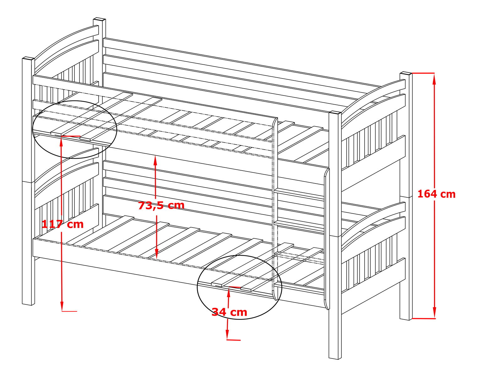 Detská posteľ Galvin je vysoká posteľ vhodná pre 2 deti s pevnou a stabilnou konštrukciou. Obe lôžka majú ochranné bariéry, ktoré chránia deti pred vypadnutím z postele. Lôžka sú spojené rebríkom a dá sa namontovať na ľavú alebo pravú stranu. Výška od zeme po horné lôžko je 114 cm, výška od zeme po dolné lôžko je 35 cm. Vzdialenosť medzi lôžkami je 75 cm. Postele sú vyrobené v súlade s normou EN-747-1:2012+A1:2015 a všetky farby a laky použité vo výrobnom procese majú požadované certifikáty a sú úplne bezpečné. Materiál je borovica a rám je celý z borovicového dreva. Matracový rám je vyrobený z brezového FLEX pásu a matrac sa musí objednať z ponuky. Posteľ sa dá montovať na ľavú alebo pravú stranu, má univerzálnu bariéru a gumené kolieska, ktoré sú bezpečné pre podlahu. Lakovanie postele je odolné a bezpečné, náter na vodnej báze je v súlade s EN 71-3:2019 a drevo pochádza zo zodpovedného lesného hospodárstva.