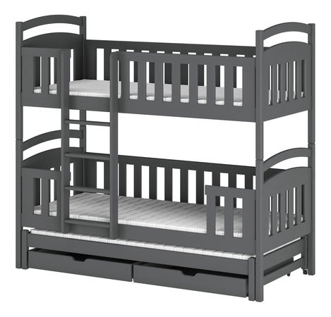 Poschodová posteľ Leon je vysoká poschodová posteľ pre 3 deti. Poschodová posteľ Vám ušetrí množstvo priestoru v miestnosti, a preto je vhodná aj do menších izieb. Posteľ Leon má tri lôžka, pričom to tretie je výsuvné a nachádza sa pod prostredným lôžkom. Ložná plocha výsuvného lôžka je o 10 cm menšia ako ložná plocha ostatných lôžok. Horné a prostedné lôžko majú ochranné bariéry, ktoré chránia dieťa pred vypadnutím z postele. Posteľ je vyrobená z borovicového dreva. Posteľ disponuje aj úložným priestorom v podobe dvoch zásuviek.