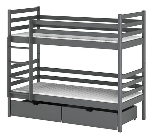 Detská posteľ Nubia s roštom a úložným priestorom vo veľkosti 90x200 cm je ideálna pre menšie miestnosti a poteší vaše deti. Posteľ má ochranné bariéry na hornom aj dolnom lôžku a rebrík na vstup. V spodnej časti sa nachádzajú dve zásuvky a kolieska, aby nepoškodili podlahu. Posteľ je vyrobená z borovicového dreva a matrac nie je súčasťou ceny. Výrobok bol vyrobený s najvyššími bezpečnostnými štandardmi EN-747-1:2012+A1:2015, farby sú bezpečné pre deti a lakovanie na vodnej báze je v súlade s EN 71-3:2019. Posteľ je montovaná pomocou imbusových skrutiek a môže uniesť maximálnu váhu 100 kg na jedno lôžko na spanie. Balenie sa skladá z troch častí a montážny návod je k dispozícii online.