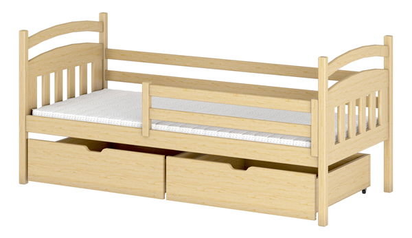 Elegantná, minimalistická jednolôžková posteľ je vhodným modelom do detskej izby. Posteľ je vyrobená výlučne z borovicového dreva. Skladá sa z pohodlného rámu a bariér obklopujúcich každú stranu. Vďaka nim dieťa nevypadne z postele počas spánku. Na jednej strane je bariéra kratšia. Pri inštalácii bariéry si viete zvoliť stranu, kam ju umiestnite. Všetky laky a farby používané na ochranu a farbenie majú požadované certifikáty a sú zdravotne bezpečné. Posteľ disponuje úložným priestorom v podobe zásuviek.