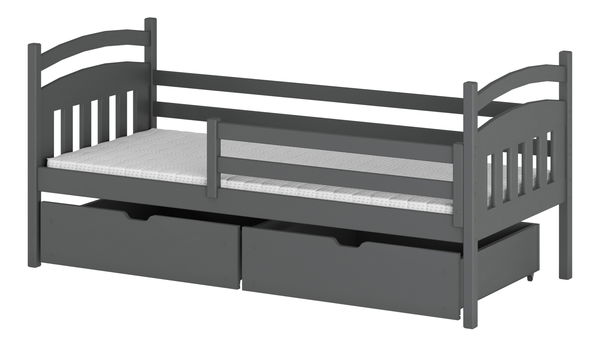Elegantná, minimalistická jednolôžková posteľ je vhodným modelom do detskej izby. Posteľ je vyrobená výlučne z borovicového dreva. Skladá sa z pohodlného rámu a bariér obklopujúcich každú stranu. Vďaka nim dieťa nevypadne z postele počas spánku. Na jednej strane je bariéra kratšia. Pri inštalácii bariéry si viete zvoliť stranu, kam ju umiestnite. Všetky laky a farby používané na ochranu a farbenie majú požadované certifikáty a sú zdravotne bezpečné. Posteľ disponuje úložným priestorom v podobe zásuviek.