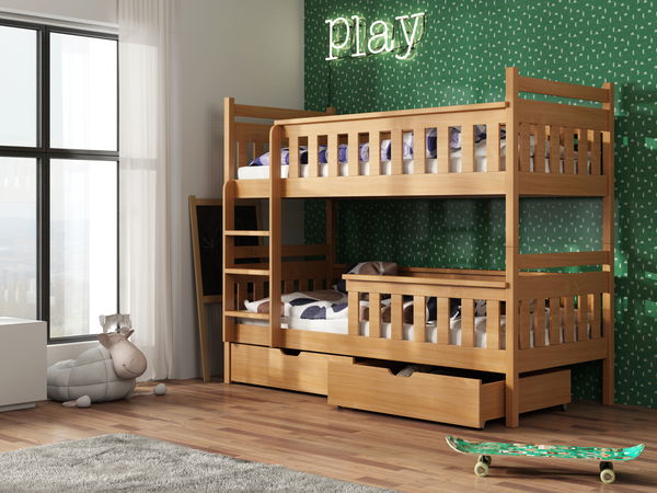 Poschodová posteľ Tommy je štýlová posteľ pre dve deti. Je vhodná pre súrodencov, ktorí spolu zdieľajú izbu. V menších izbách šetria priestor. Vzdialenosť medzi lôžkami je 68 cm. Výška od zeme po horné lôžko je 115 cm, výška od zeme po spodné lôžko je 35 cm. Posteľ má ochranné bariéry, ktoré zabraňujú vypadnutiu počas spánku. Posteľ je vyrobená z masívnych borovicových dosiek. Stojí na štvorcových nožičkách, ktoré jej dodávajú stabilitu. Posteľ disponuje úložným priestorom. Gumené kolieska zásuviek nepoškriabu podlahu.