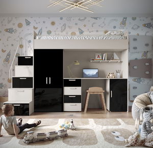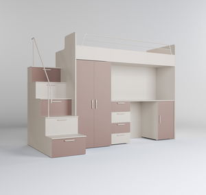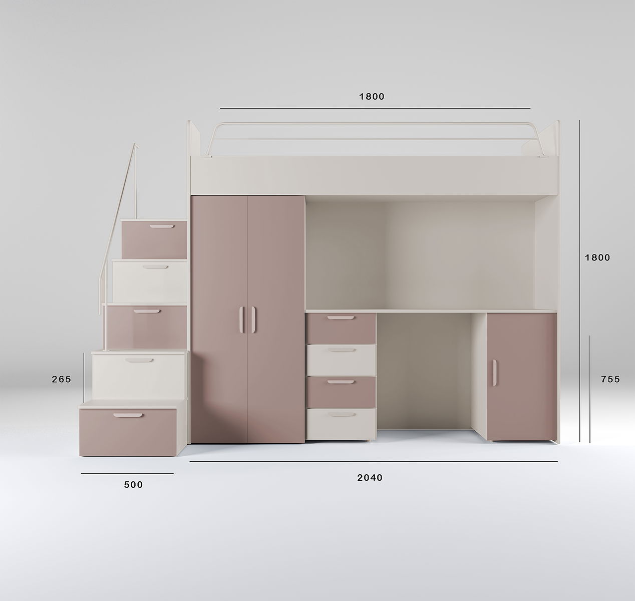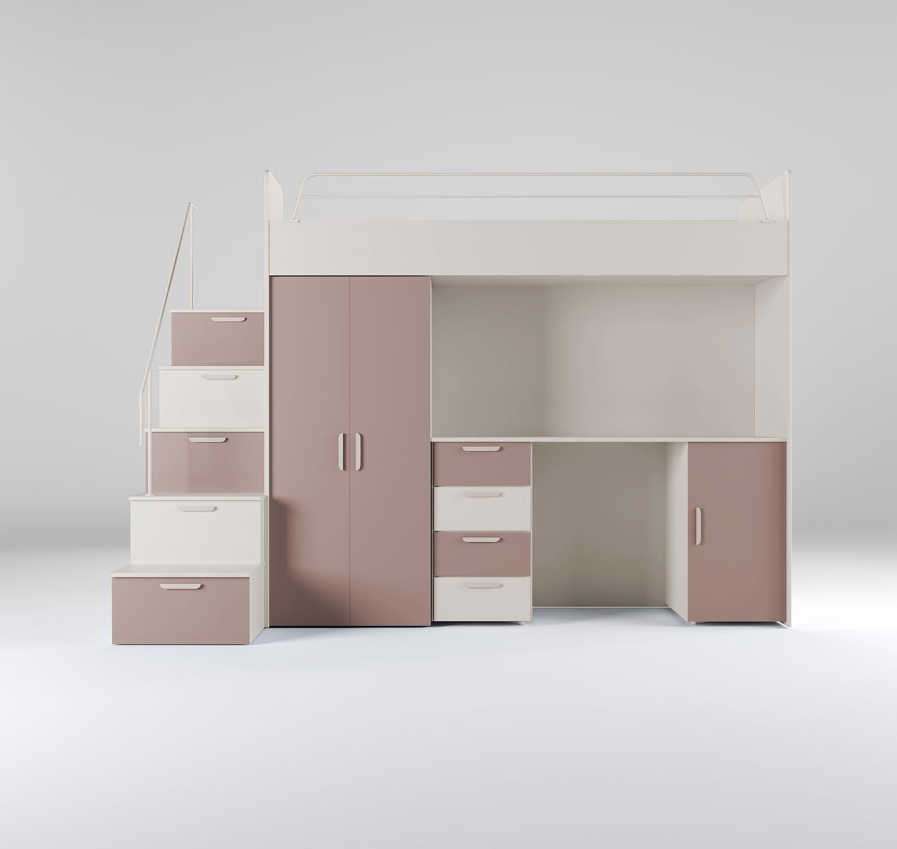 Set do detskej izby obsahuje praktické riešenia pre menšie interiéry. Vyrobené z kvalitnej MDF dosky, s akrylovým povrchom dvierok a zásuviek s hrúbkou 0,8 mm. Súčasťou sú detská posteľ, PC stolík, skriňa a schody. Rozmery posteľ: 180 x 204 x 86 cm, PC stolík: 75,5 x 140 x 50 cm, skriňa: 138 x 60 x 50 cm, schody: 133,5 x 50 x 120 cm. Nosnosť až 80 kg. Rošt latový, plocha spania 80x200 cm. Odporúčaný penový matrac s výškou 15 cm. Úložný priestor zabezpečujú skriňa a PC stolík.