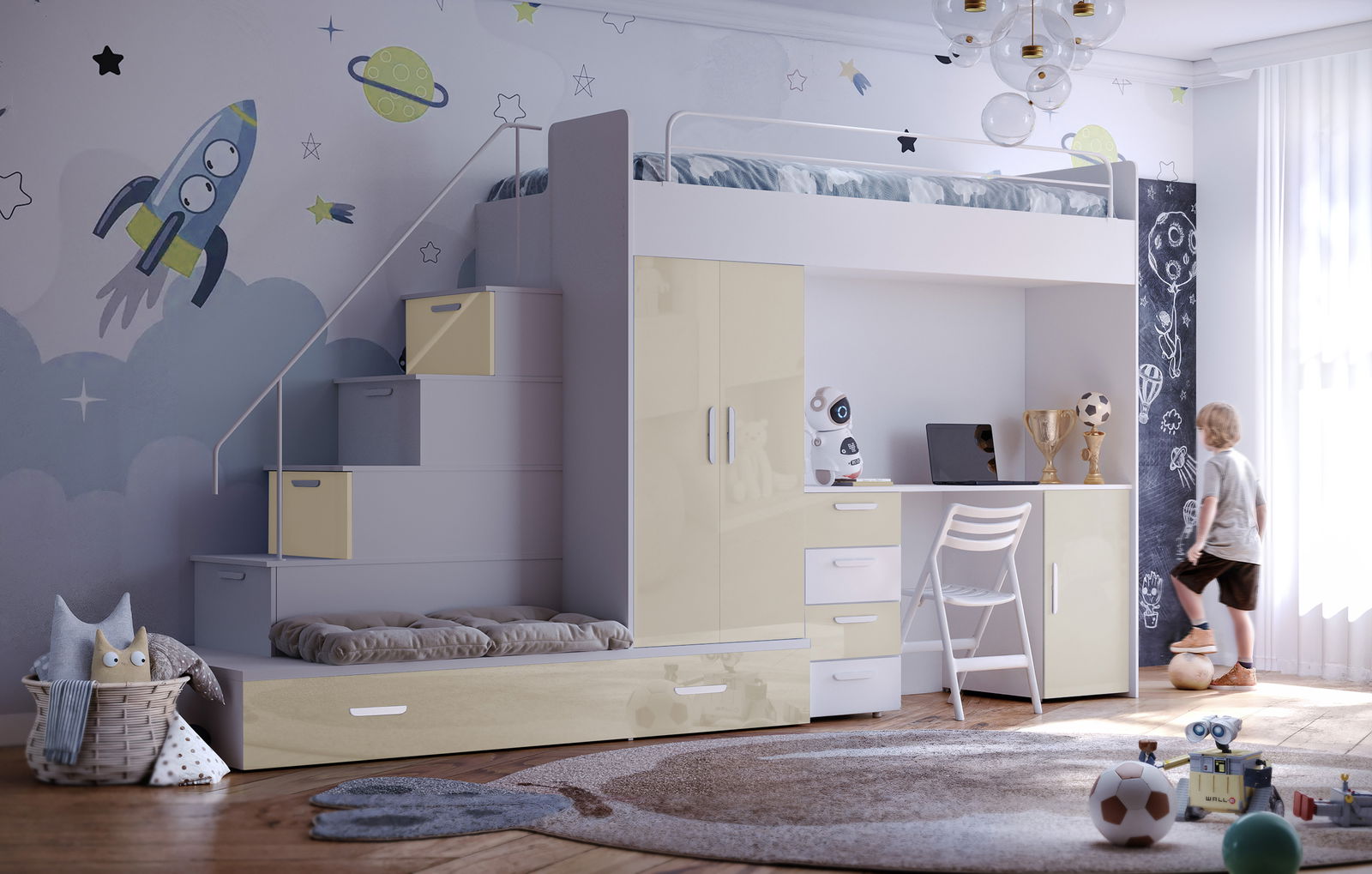 Detská posteľ Ruby V je veľmi praktický set do detskej izby, ktorý zahŕňa posteľ, PC stolík, skriňu a schody. Je ideálny aj do menších interiérov a je vyrobený z kvalitnej MDF dosky. Dvierka a zásuvky majú povrch z akrylovej lakovanej fólie s hrúbkou 0,8 mm. Posteľ má rozmery 180 x 204 x 86 cm, PC stolík 75,5 x 140 x 50 cm, skriňa 104 x 60 x 50 cm a schody - x 180 x 85 cm. Nosnosť postele je 80 kg a rošt je latový. Do tejto postele odporúčame použiť penový matrac s výškou 15 cm. Úložný priestor je zabezpečený skriňou a PC stolíkom a pri montáži je možné zvoliť pravé aj ľavé prevedenie. V cene nie sú zahrnuté doplnky, vankúše a dekorácie. Plocha spania je 80 x 200 cm.